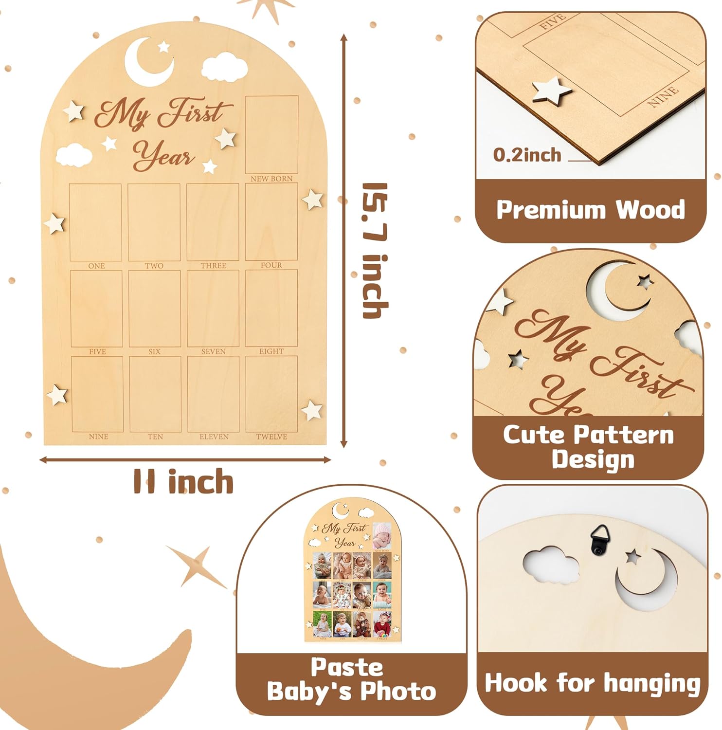 - Unique Design: Our baby picture frame come with hook and point stickers for you to hang and decoration. It is made of quality and thick wooden material for long-term use. The wood board with your baby's photo pasted on it will surely be the most beautiful sight at your baby's first year party.