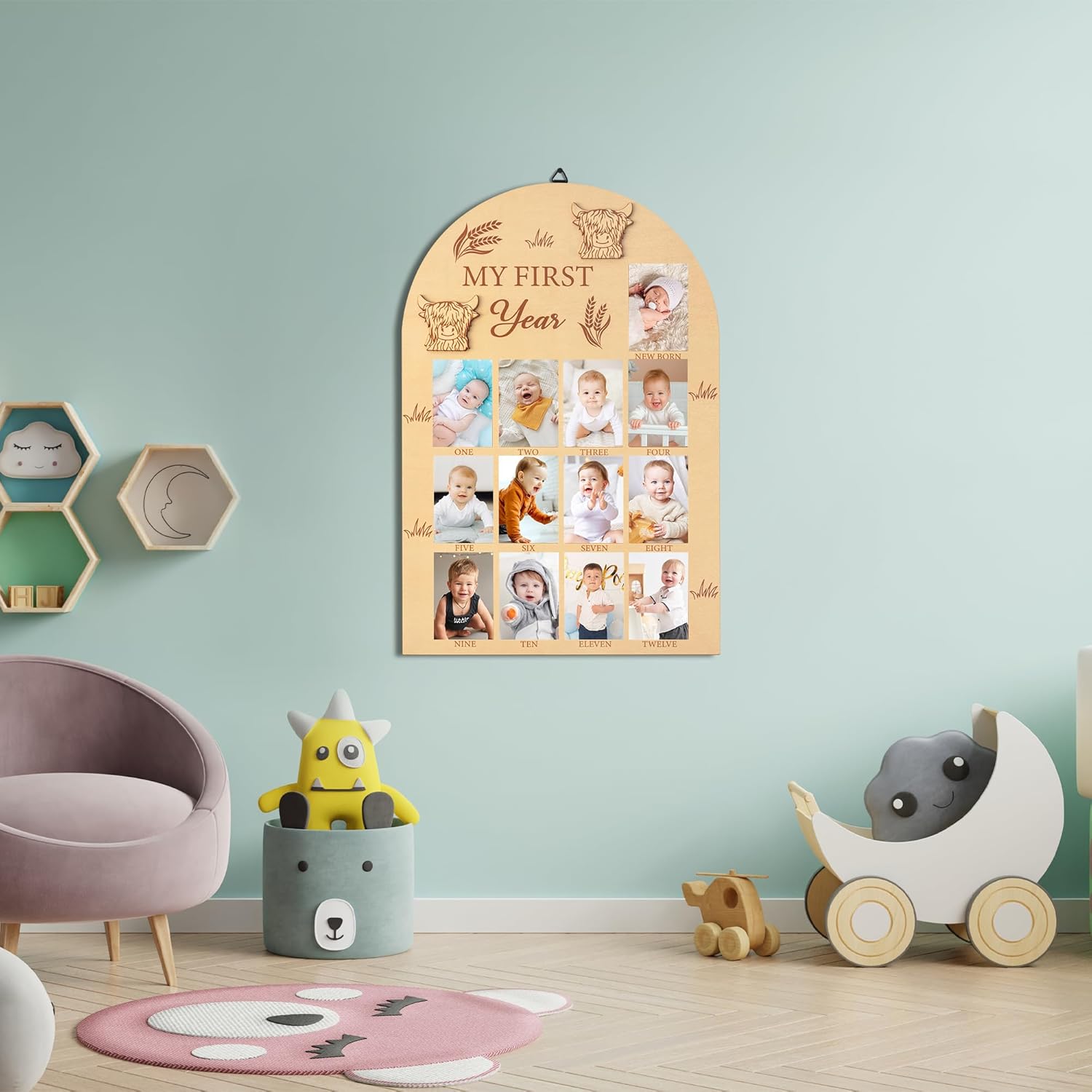 - Cute Highland Cow Design: Our baby picture frame come with hook and point stickers for you to hang and decoration. It is made of quality and thick wooden material for long-term use. The highland cow board with your baby's photo pasted on it will surely be the most beautiful sight at your baby's first year party.