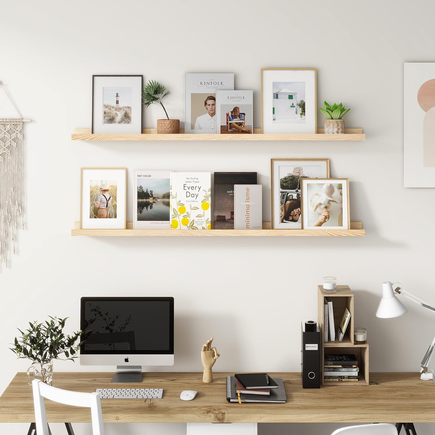 Picture Ledge Shelf, Floating Shelves Set of 2, Solid Pine Wood 55'' Long Large Nursery Book Shelves for Toys Storage, Kids Bookshelf for Living Room Bedroom Decor Books Photo Frames, Natural