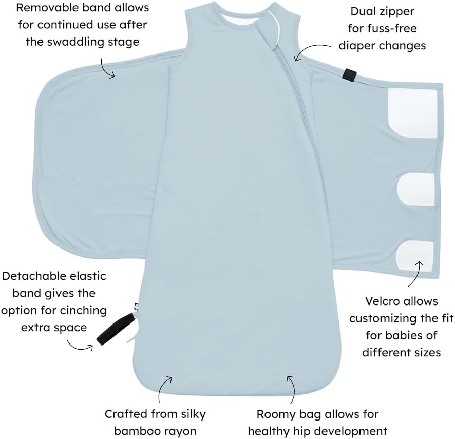 - Fully removable swaddle wrap attached to the sleep bag via Velcro, which allows for different positioning of the swaddle as baby grows.