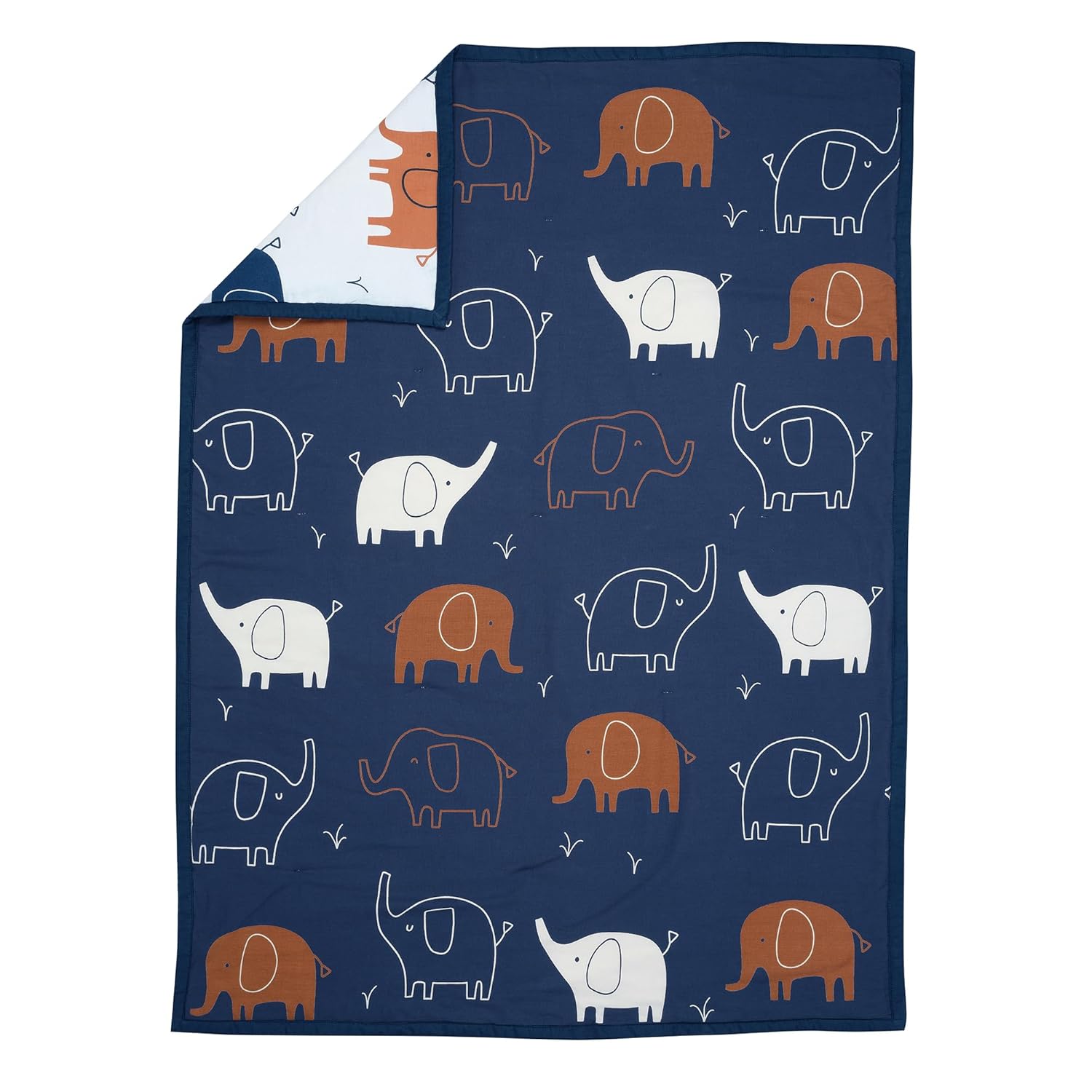- The quilt is indigo blue on the front side and reverses to a white ground on the back featuring contemporary elephants