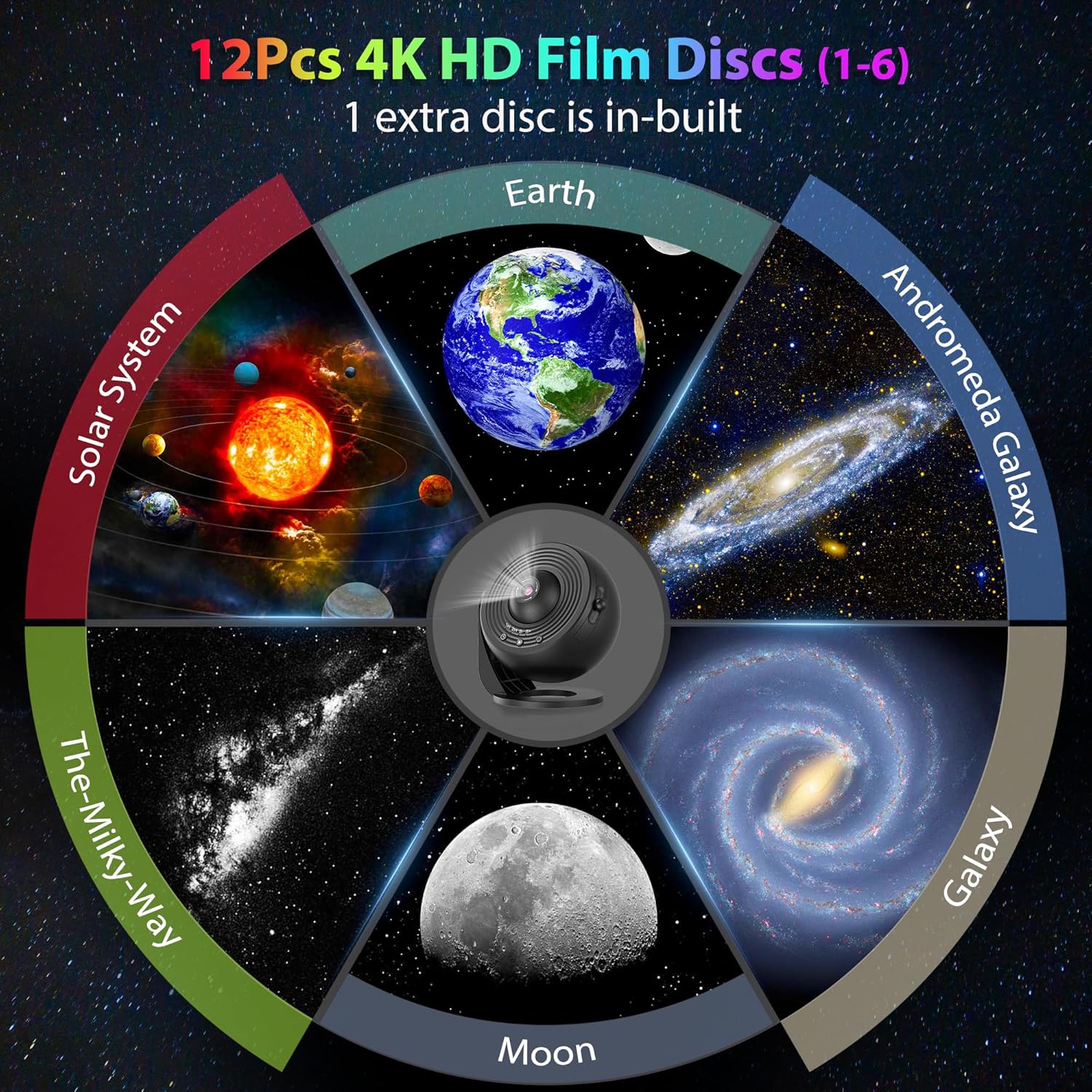 - 【Upgraded Galaxy Projector】: Please pull the tray handle to replace the slide to switch the galaxy pattern. Transform your room into 13 stunning universe spectacles using film discs. The pattern names are 1: Solar System, 2: Earth, 3: Moon, 4: The Milky Way, 5: Galaxy, 6: Andromeda Galaxy, 7: NGC4302-NGC4298, 8: Hubble Deep Filed, 9: M60-UCD1, 10: North America Nebula, 11: Mystic Mountain and 12: Small Magellanic Cloud. 13: the Galaxy (in-built).