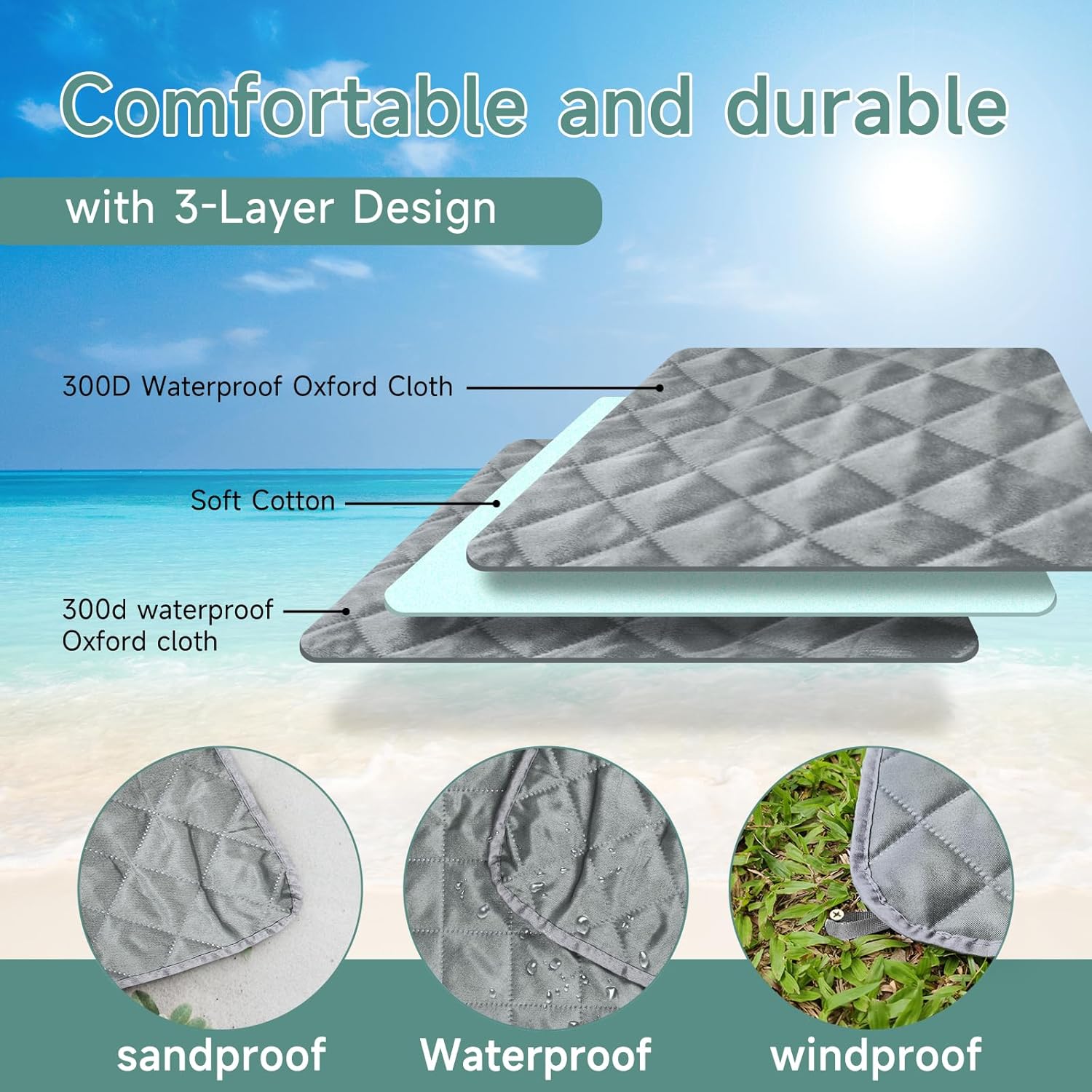 - Softness & Waterproof: Made of three layers, our picnic mat has 300D Oxford fabric on the two sides, and soft cotton in the middle, which is waterproof and sand-proof. It is perfectly suitable for sitting or lying on grass, the beach, the floor, or any kind of surface, giving you a soft and comfortable feeling.