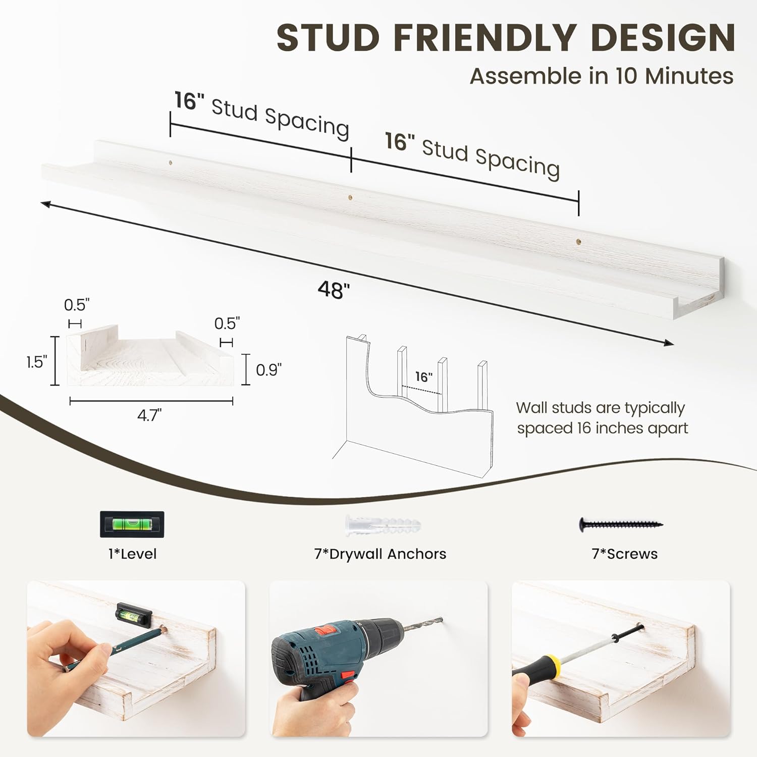 Picture Ledge Shelf, 48 Inch Long Floating Shelves for Wall, Nursery Bookshelf for Storage with Lip, Rustic Elm Wood Photo Ledge Shelves for Bedroom, Living Room, Kitchen (White, 48in Set of 2)