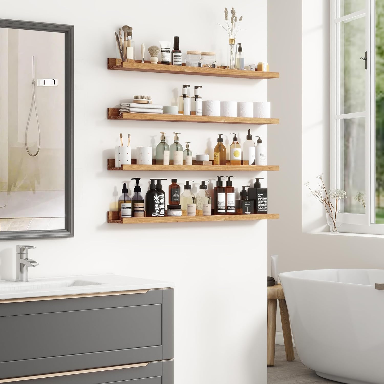 - 【Wall-Mounted Floating Shelves】Add style and storage to any room with these floating shelves. Perfect for showing off home decor, photos, plants, and more. Place them above the fireplace, entryway, desk, or in other unused wall spaces to instantly enhance your space.