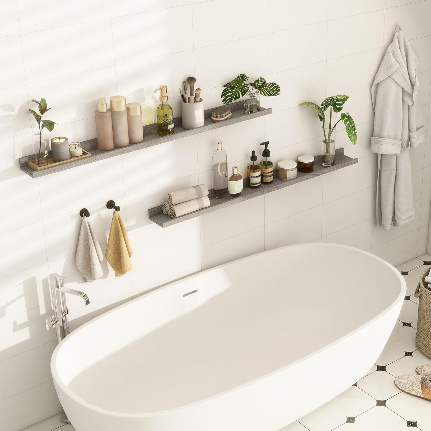 Picture Ledge Shelf, 48 Inch Long Floating Shelves for Wall, Nursery Bookshelf for Storage with Lip, Rustic Elm Wood Photo Ledge Shelves for Bedroom, Living Room, Kitchen (Grey, 48in Set of 2)