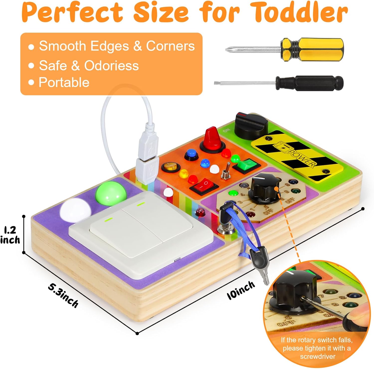 - Safe & Sturdy Wooden Toys: The busy boards toys are made of natural wood,carefully handmade with smooth corners and edges, all the various buttons/switches/shifters are solidly installed and ensure your child safe during use. Pass the US toy standard CPSIA & ASTM test. A baby sensory board and small screwdriver is include in package, baby busy board requires 2 AAA batteries (not included).