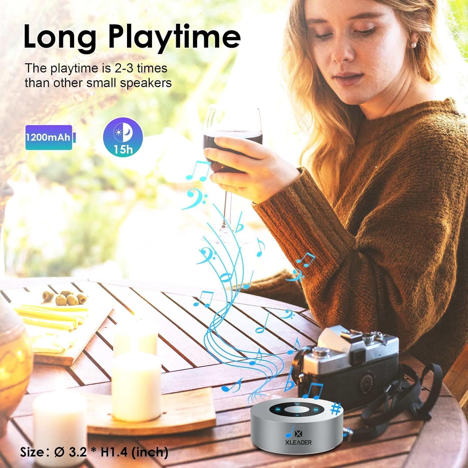 - 【LED Touch Design】XLeader small bluetooth speaker has a stylish and modern exterior, full of technological sense of design. The LED Touch Screen offers you funny control, easy to play songs and resize sounds. The glowing buttons are very useful in dark bedroom or night outdoor party.
