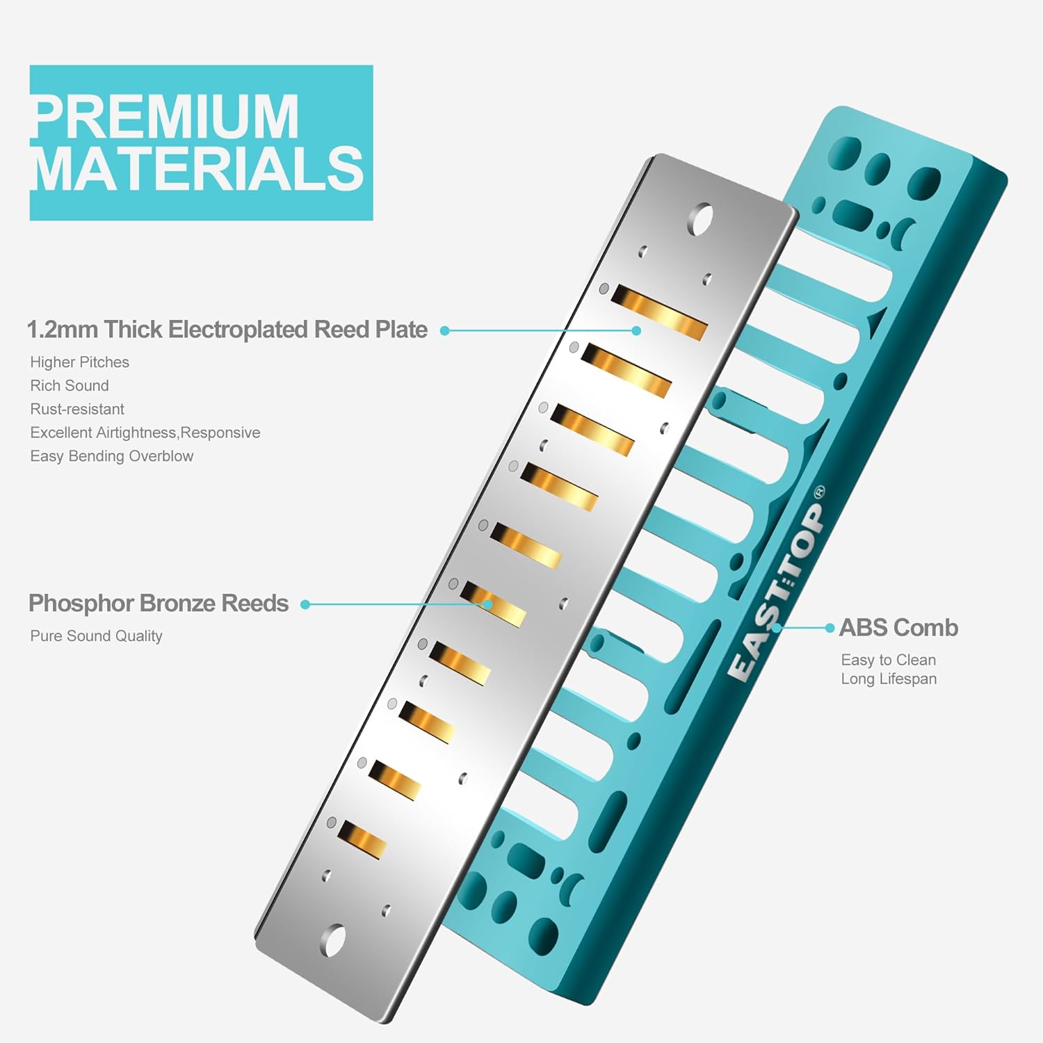 - Professional harmonica for adult-East top 10 hole professional diatonic harmonica, suitable for Blues, Folk, Rock, Country, Jazz etc. Great for professional harmonica players and beginners. This Professional Blues Harmonica has exquisite workmanship, beautiful appearance, accurate tone and responsive.