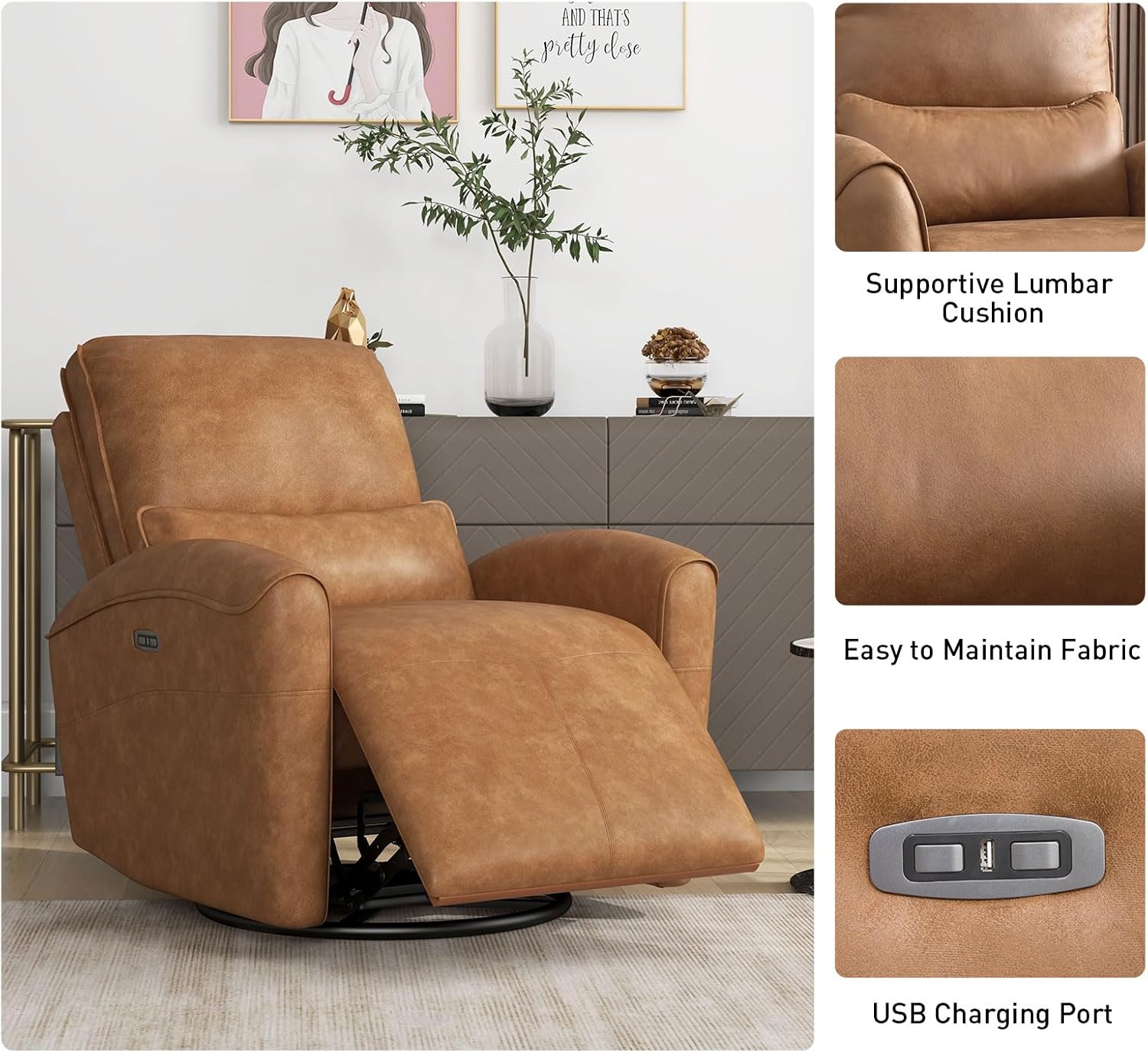 Bonzy Home Power Swivel Rocker Recliner Chair with USB Port, 23.2" Wide Seat, Fixed Lumbar Support, Upholstered Glider Chair for Nursery Living Room, Brown