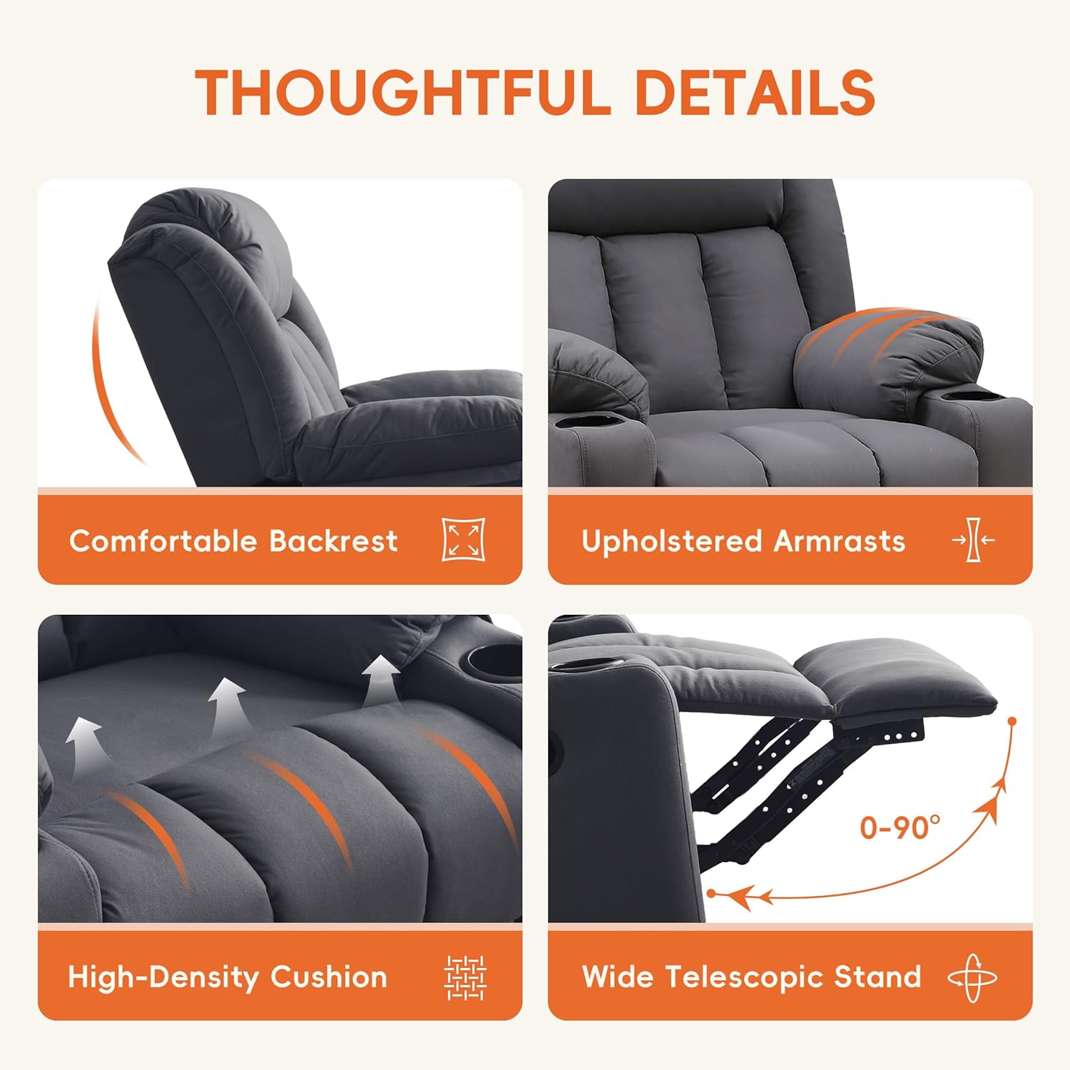 Rocker Swivel Recliner Chair for Adults, Overstuffed Large Manual Recliner Glider with Massage and Heat, Comfy Soft Fabric Living Room Reclining Sofa Chair(Technical Grey)