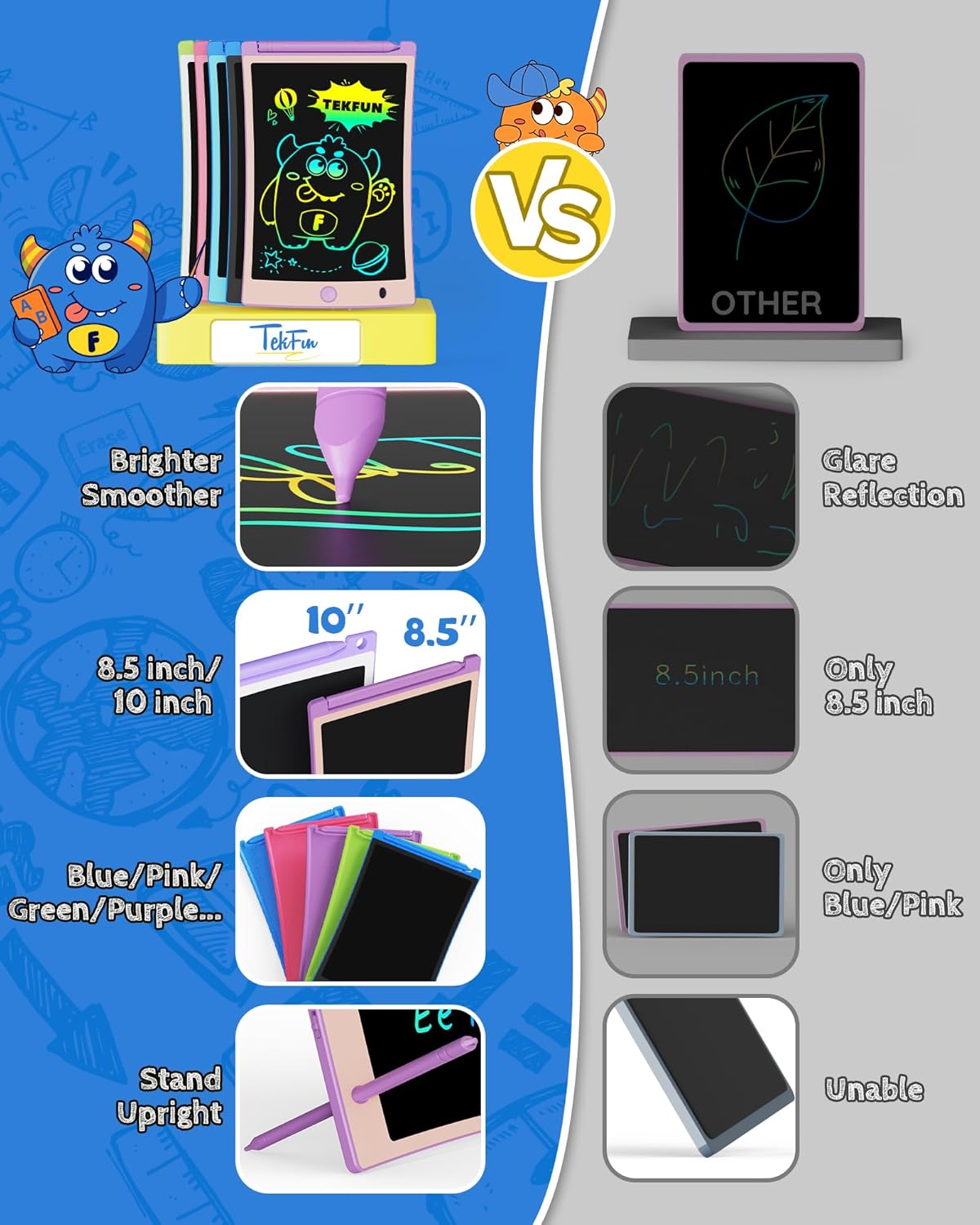 - Eye-Friendly: Say goodbye to blue light and glare with TEKFUN's LCD screen. Your child can draw for hours without straining their eyes, making it a great electronic alternative for preventing visual impairment.