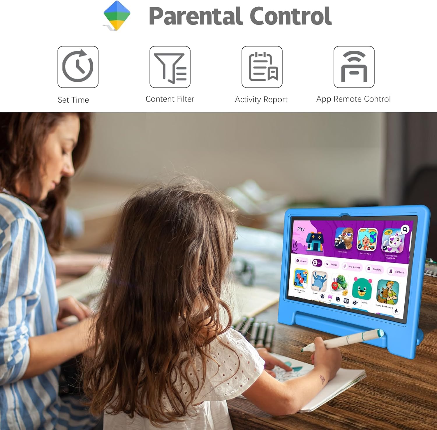 - Easy Parental Control: Google Family Link Parent Dashboard allows you to limit screen time, set content filters, and password protection. Allow the content you want and learn about their activities on the kids tablet gives you complete control of every aspect, which will give you peace of mind when you hand your child the tablet.