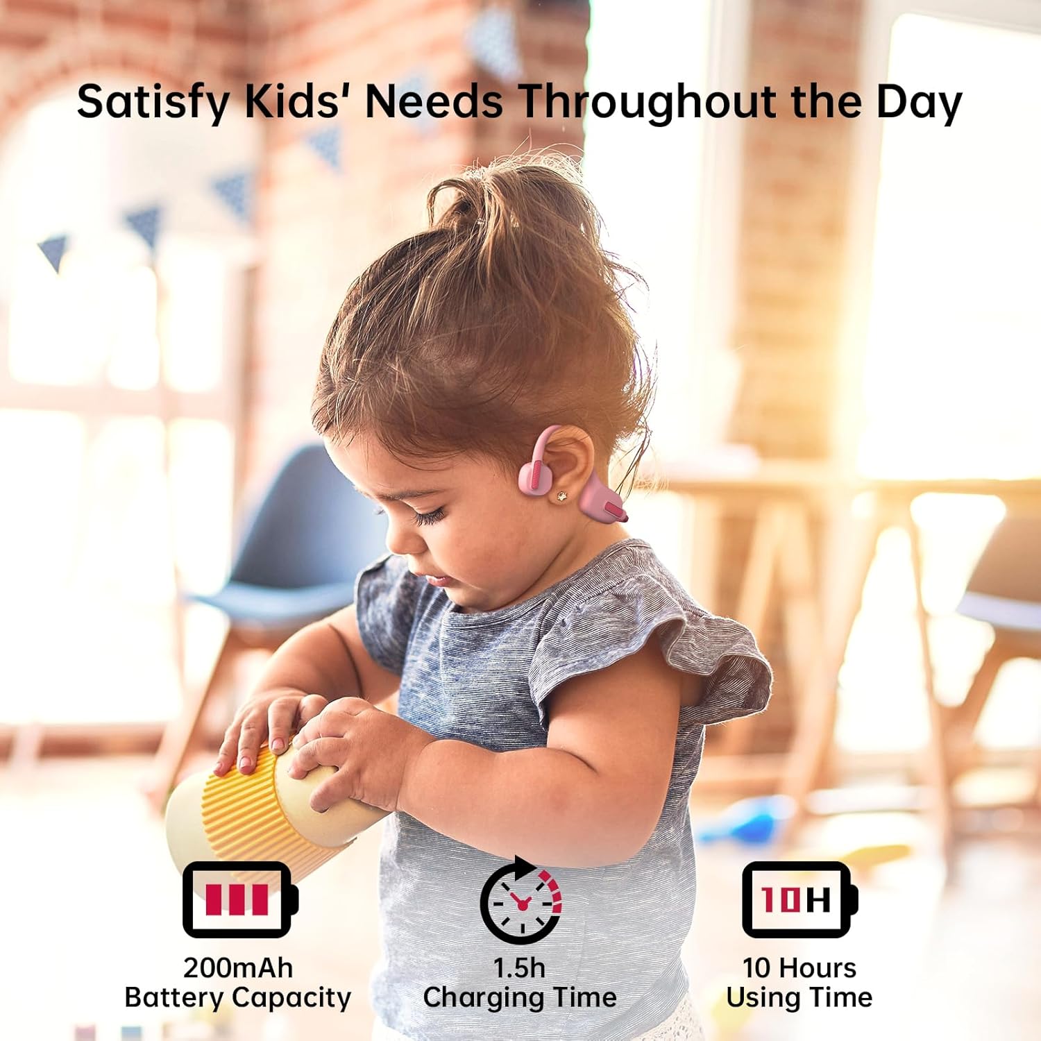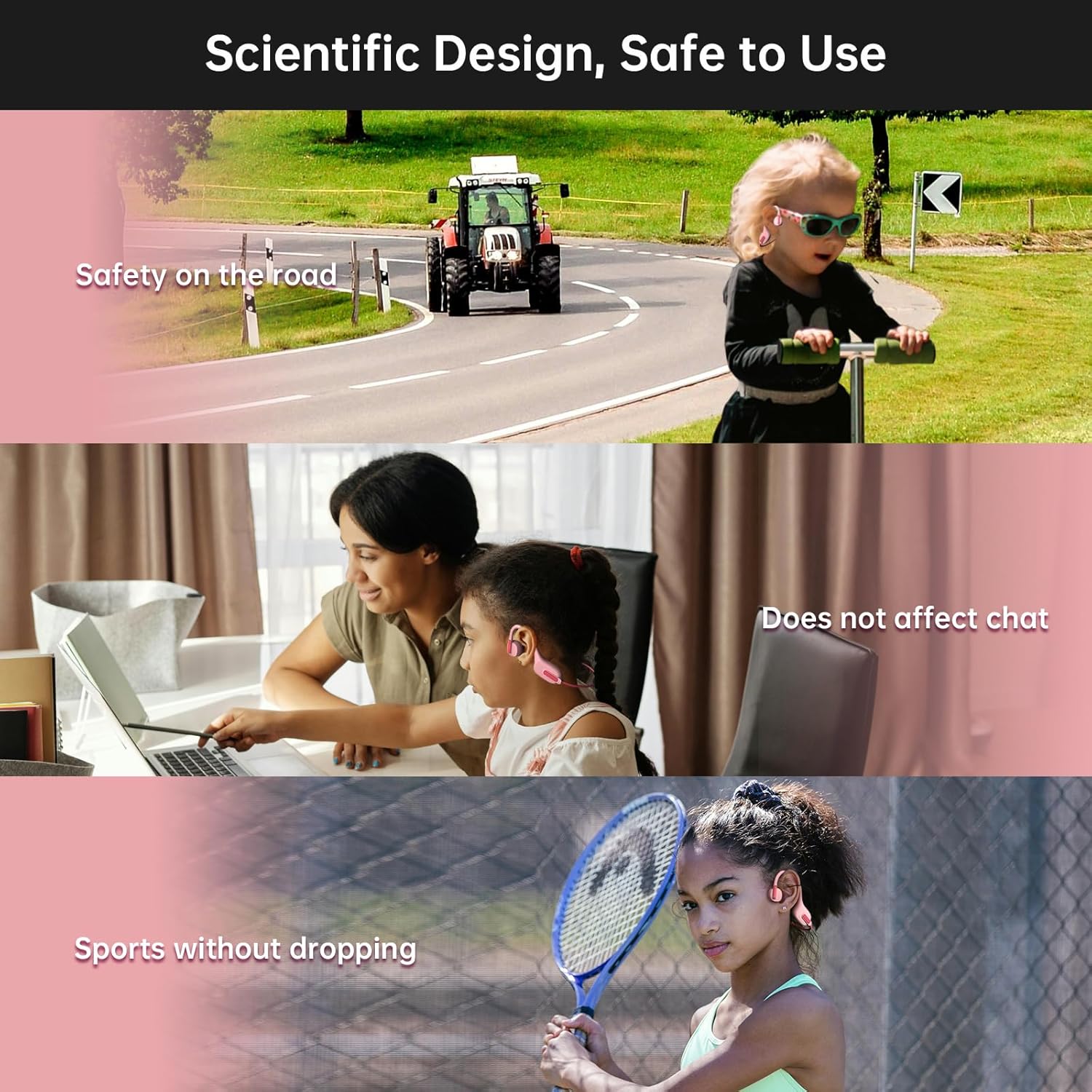 - [Safer Design] Wearing our air conduction kids headphones wireless with built-in microphone provides directional, quality audio that won't interfere with hearing any of the outside world around them, so your kids can hear clearly when a car is approaching from behind.