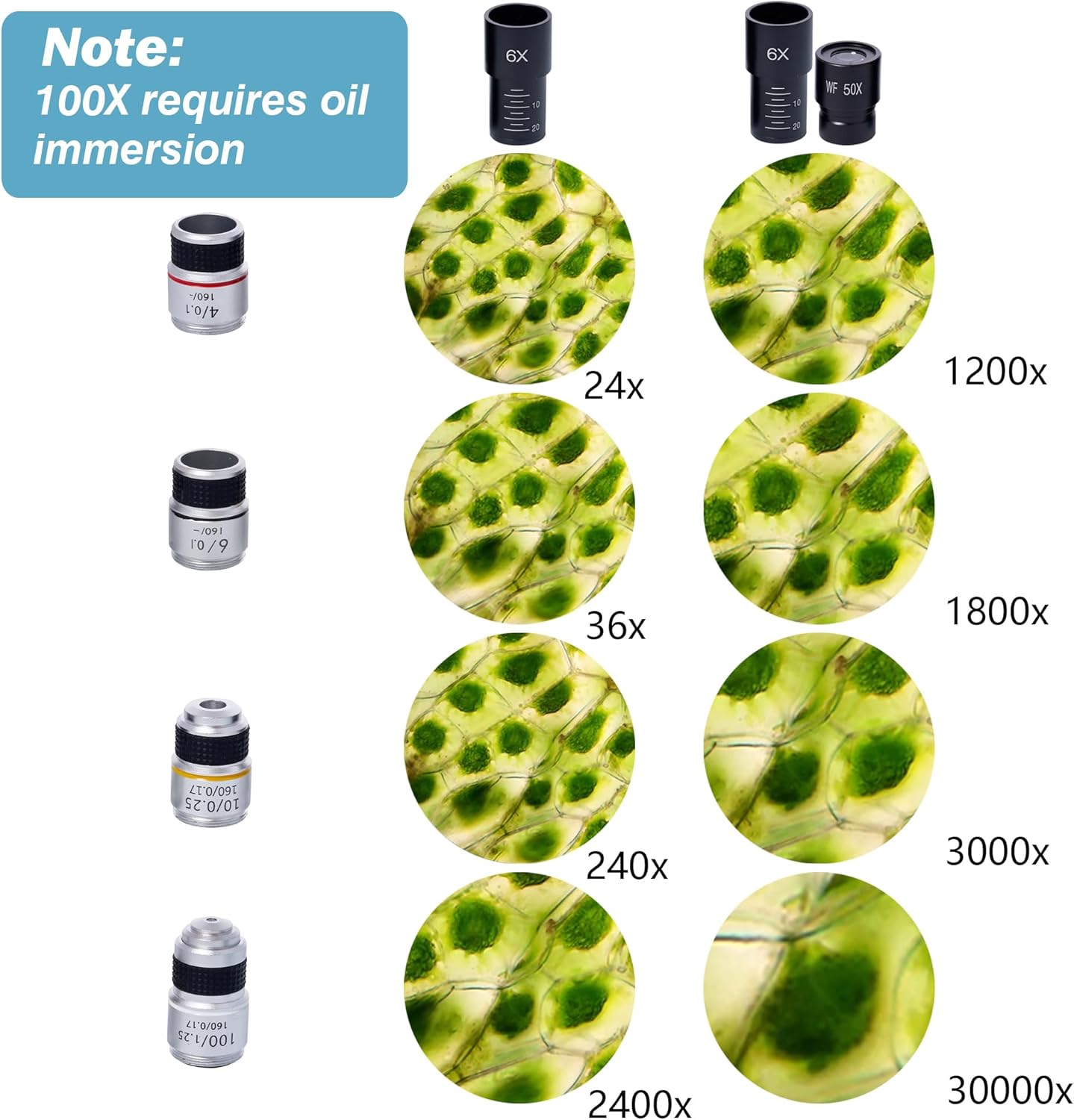 - Binocular Laboratory microscope 200X to 5000X magnification range using four achromatically-corrected objective lenses and two pairs of eyepieces.The adjustable binocular microscope for kids viewing head uses sliding interpupillary adjustment, and can be rotated 360 degrees. Note: 100 times requires oil immersion.