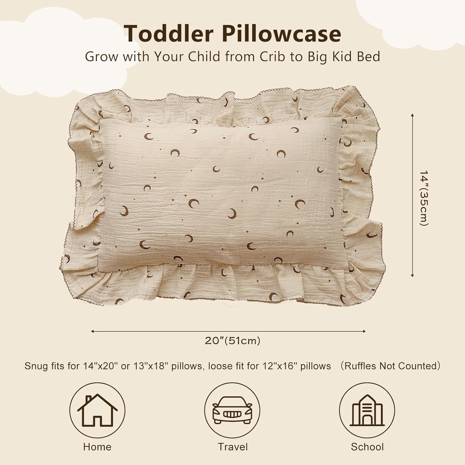 - Multifunctional: Our toddler pillowcase is suitable for various settings, including cribs toddler beds or even during travel. It's a versatile addition to your toddler's bedding collection. Muslin pillowcase provides a gentle touch against children delicate skin, promoting a restful night's sleep