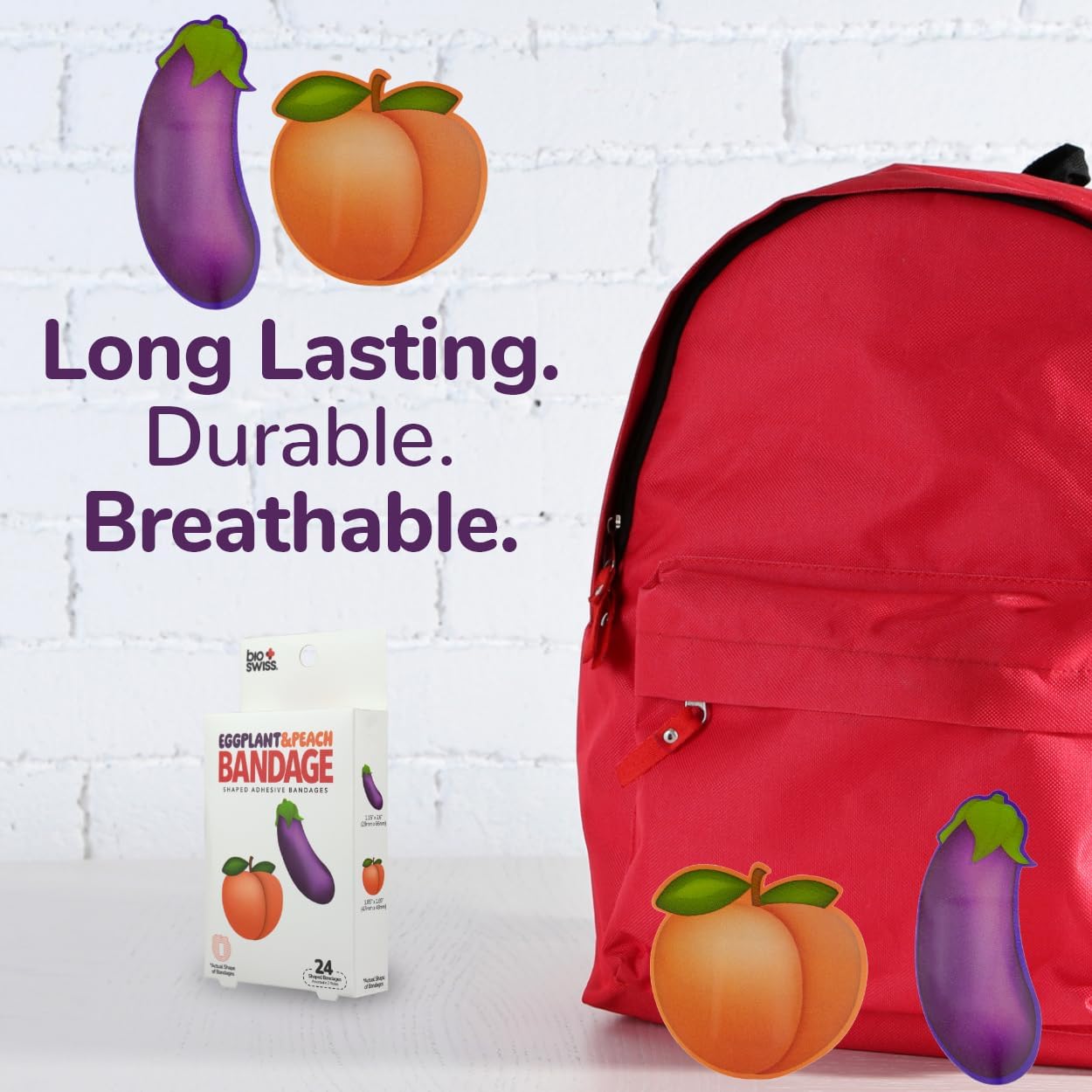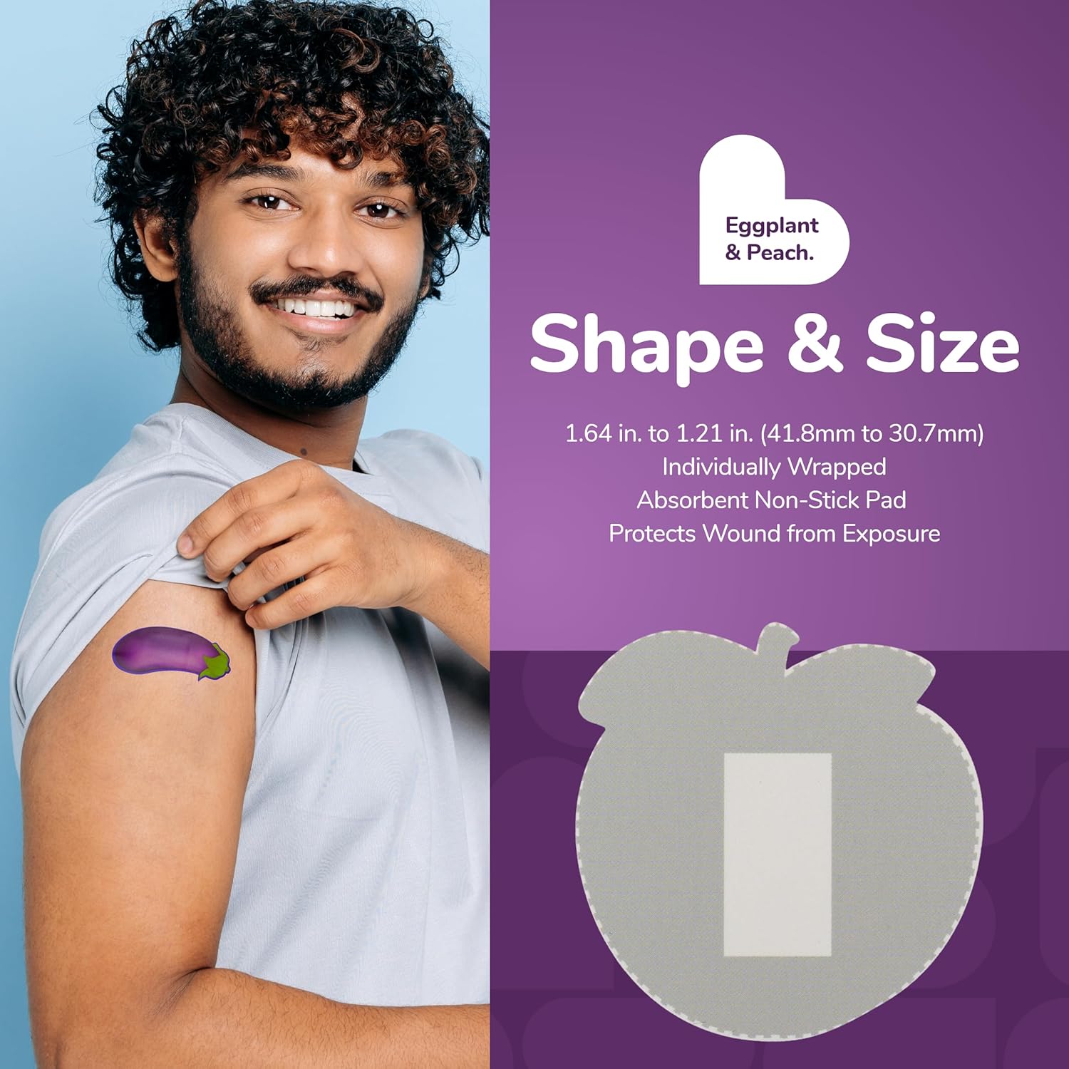 - EGGPLANT AND PEACH BANDAGES: This 24 piece pack of Eggplant and Peach bandages feature fun Eggplant and Peach shapes, and is sure to induce laughter and smiles while protecting wounds such as cuts, scrapes, and burns; sticky bandages come in a cute decorative cardboard box which makes for an excellent novelty gag gift or stocking stuffer for adults