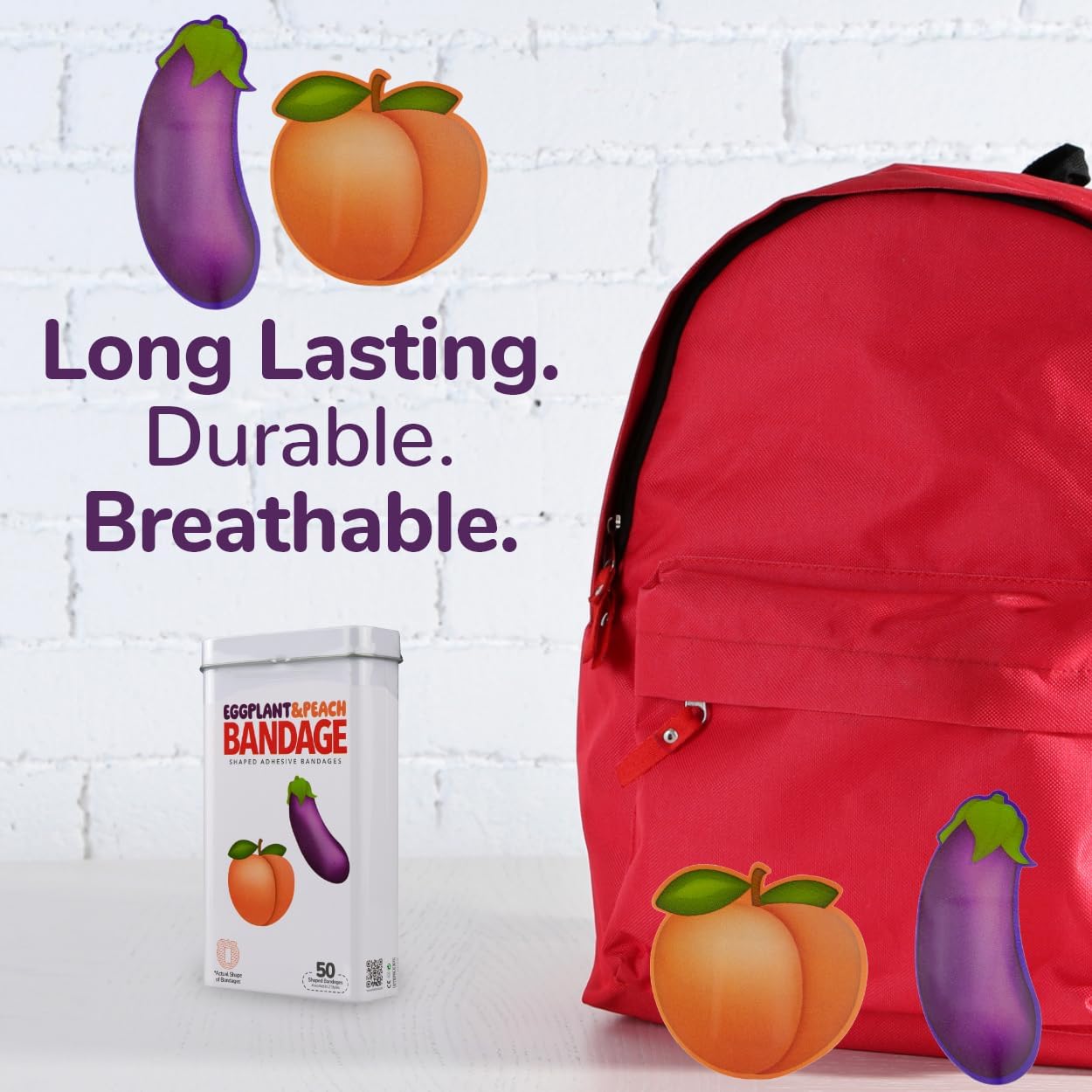 - EGGPLANT AND PEACH BANDAGES: This 50 piece tin container of Eggplant and Peach bandages feature fun Eggplant and Peach shapes, and is sure to induce laughter and smiles while protecting wounds such as cuts, scrapes, and burns; sticky bandages come in a cute decorative cardboard box which makes for an excellent novelty gag gift or stocking stuffer for adults