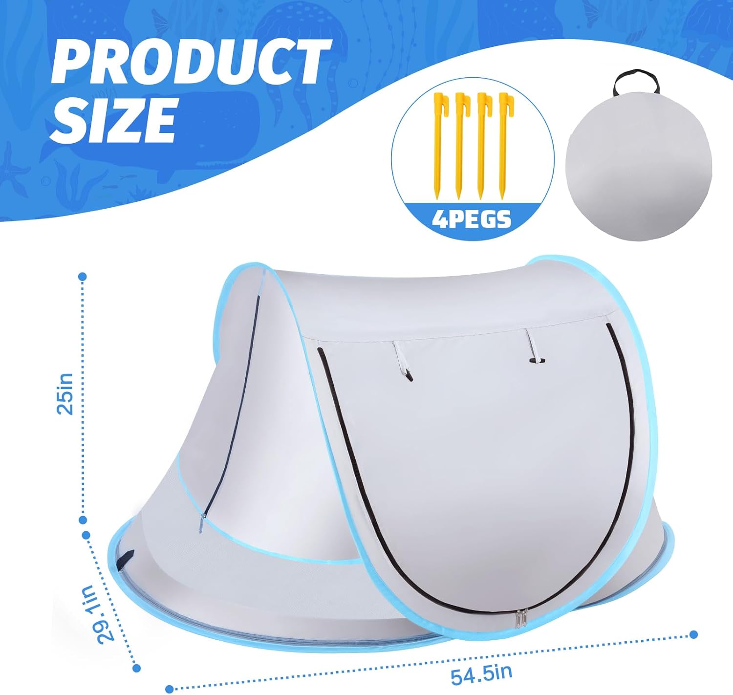 - 【Anti UV】: This baby beach tent is covered with a special silver coating to ensure optimum UV resistance. Ultraviolet grade 50 + (UPF 50 +). The compact design, which is lightweight and collapsible, provides all-round protection for the baby on a beach trip, protecting the baby's skin from the sun for a long time and keeping the inside of the tent cool and comfortable