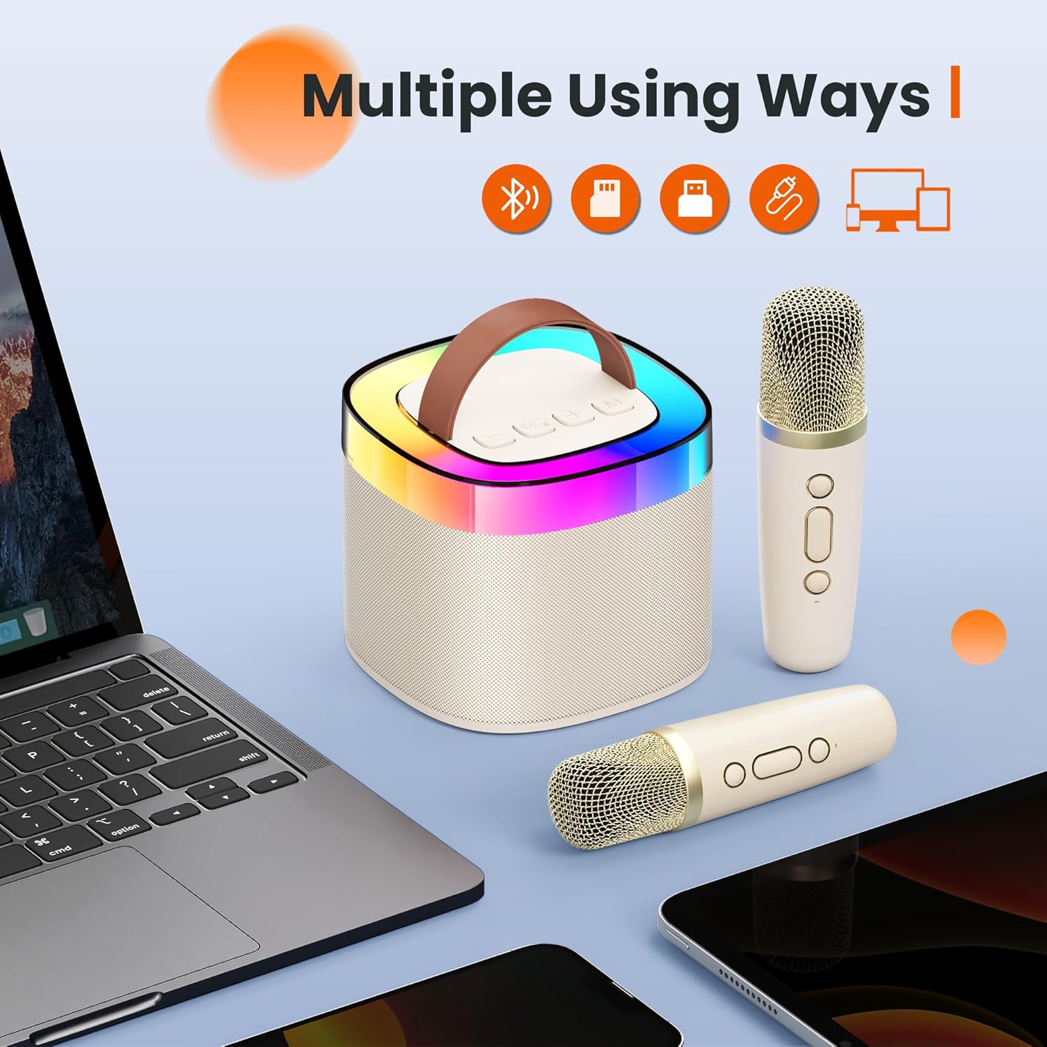 - Light Up the Party: YLL singing karaoke machine uses 16 beads for multiple RGB streaming effects, giving you an immersion karaoke experience. Let you like a star shine with the disco lights that create an impressive and dynamic karaoke experience. The independent light button allows for easy control and endless entertainment for hours on end. YLL karaoke speaker with mic create a good atmosphere for birthday parties, outdoor activities, family gatherings