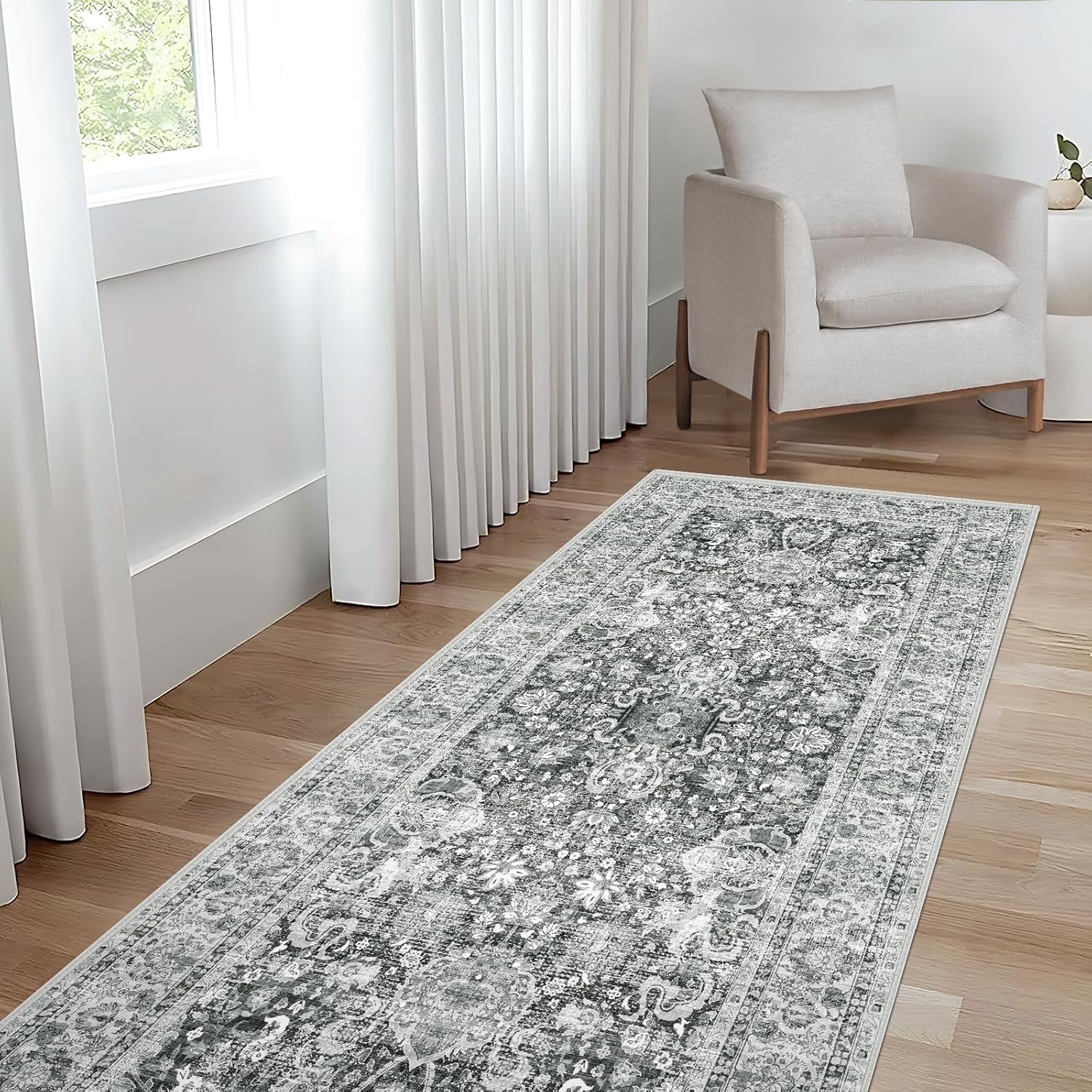 Grey Rug Runner 3x7 Ft Washable Hallway Runner Rug Runner Non-Slip Boho Vintage Runner Rugs with Rubber Backing Soft Distressed Carpet for Kitchen Bedroom