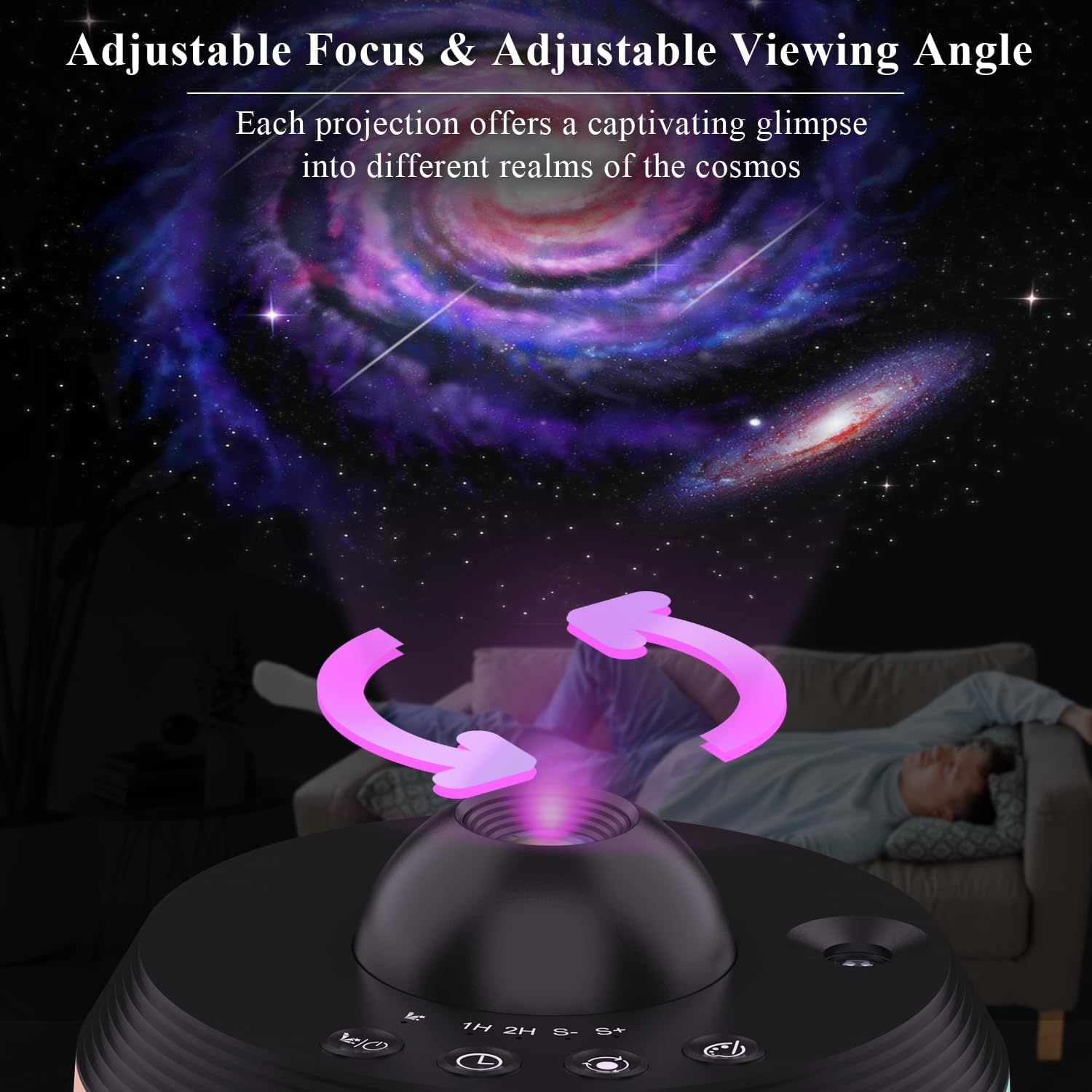 - Crystal Clear 4K HD Projection & Adjustable Focus - Upgraded Lenses and Film sizes: The galaxy star projector has a high-definition optical lens, which can project clear and high-resolution images. Rotating the top focusing head to adjust image clarity regardless of the projection distance. Support a projection distance of up to 16.4ft and an area of 256 sq ft. Featuring upgraded lenses and film sizes, our star projector delivers unparalleled precision and definition, ensuring that every constellation, nebula, and shooting star shines with breathtaking clarity.
