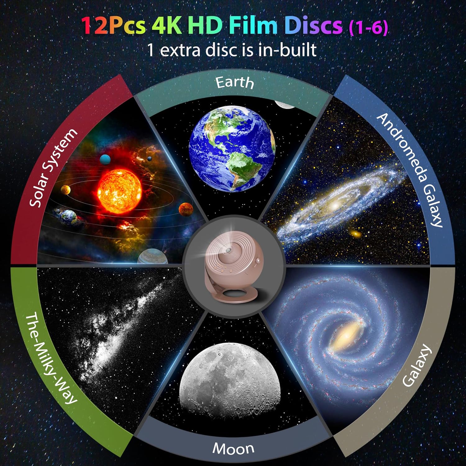 - 【Upgraded Galaxy Projector】: Please pull the tray handle to replace the slide to switch the galaxy pattern. Transform your room into 13 stunning universe spectacles using film discs. The pattern names are 1: Solar System, 2: Earth, 3: Moon, 4: The Milky Way, 5: Galaxy, 6: Andromeda Galaxy, 7: NGC4302-NGC4298, 8: Hubble Deep Filed, 9: M60-UCD1, 10: North America Nebula, 11: Mystic Mountain and 12: Small Magellanic Cloud. 13: the Galaxy (in-built).