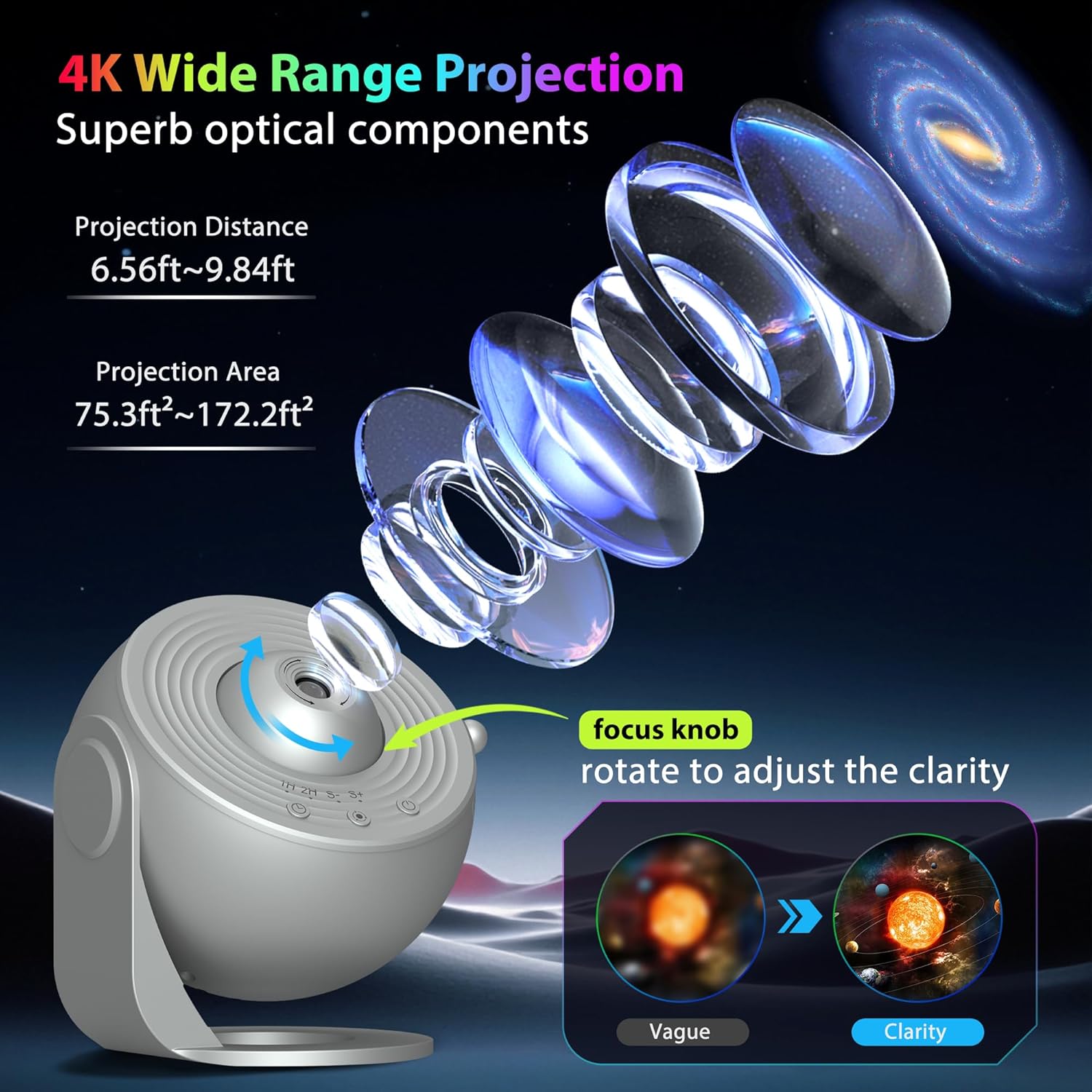 - 【Adjust the Knob to Get HD Projection】:This galaxy projector uses high-quality optical components to present vivid colors and projector large and bright star images. Please adjust the focus of the galaxy light projector by rotating the focusing head for clear and realistic imaging. ( The ultimate effect depends on the ceiling area, room lighting brightness, and the projection length and angle)
