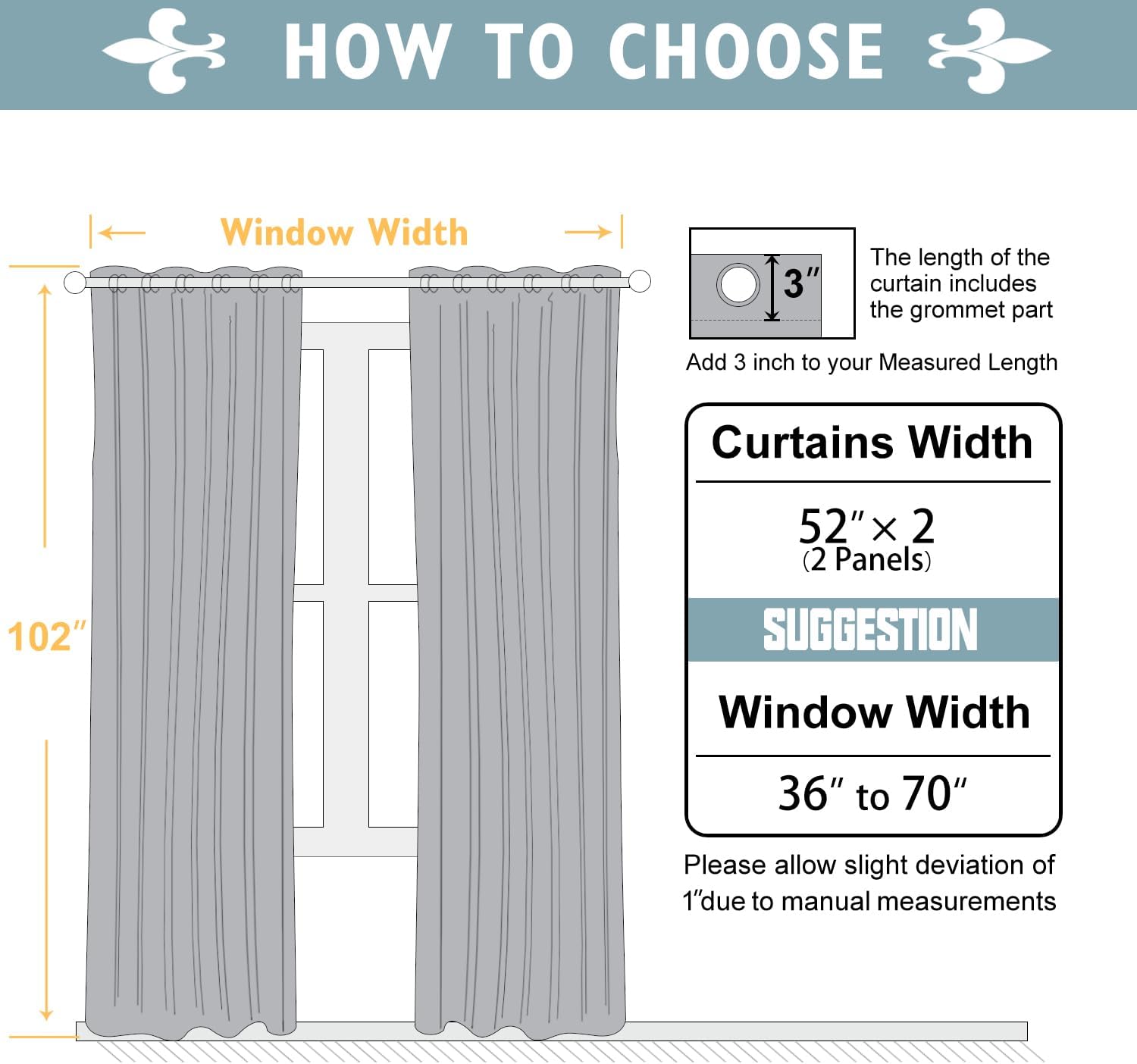 - SET DETAILS: 2 panels per package. Each panel measures 52 inch wide by 102 inch length with 8 silver metal grommets (1.6 inch inner diameter) on top, easy to install and slide.