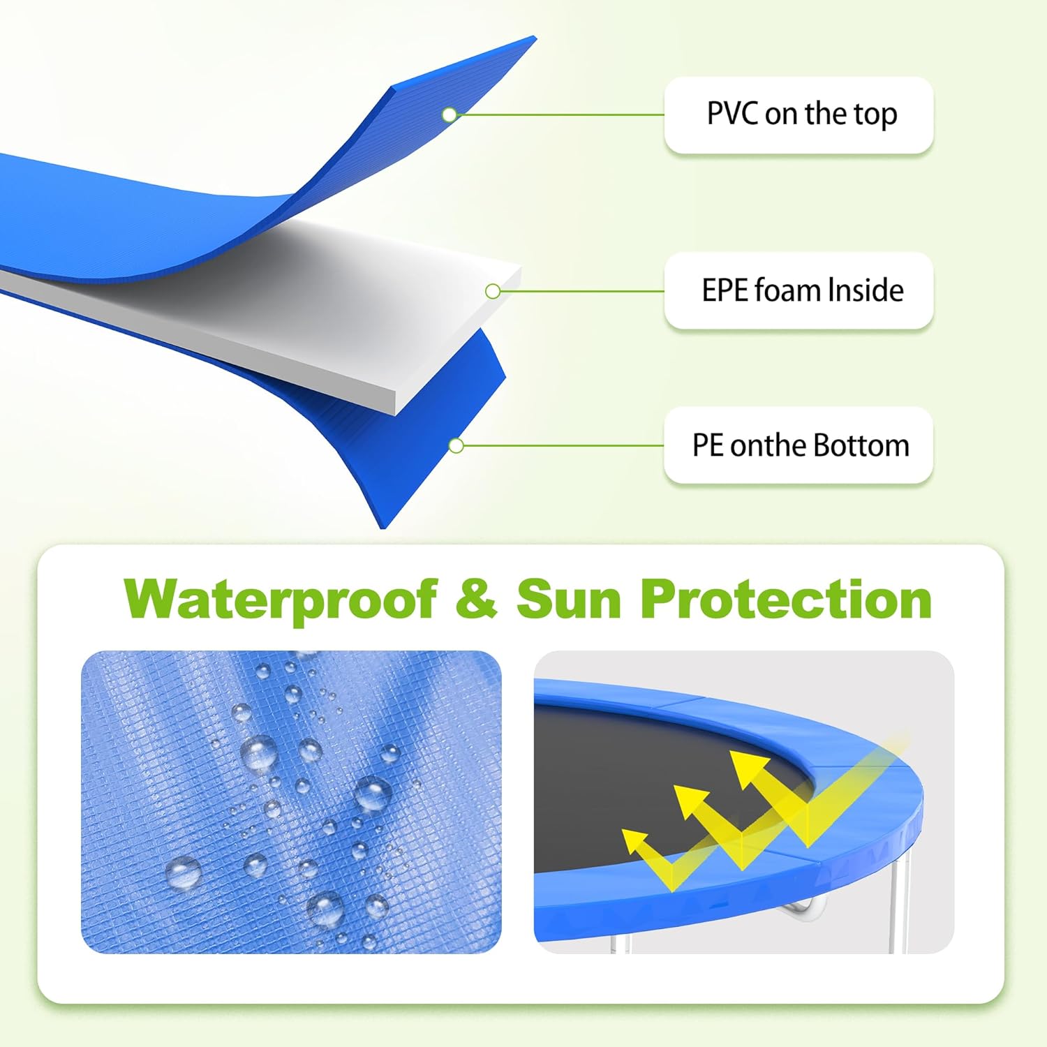 - [ High-Quality Material ] The trampoline pad is made of crafted from 3 layer of premium material including PVC, high-density EPE foam and 130g/m² PE, the Spring pad can firmly support you with great bouncing. This safety pad can perfectly cover all springs and ensure that you and your family do not get pinches and scrapes