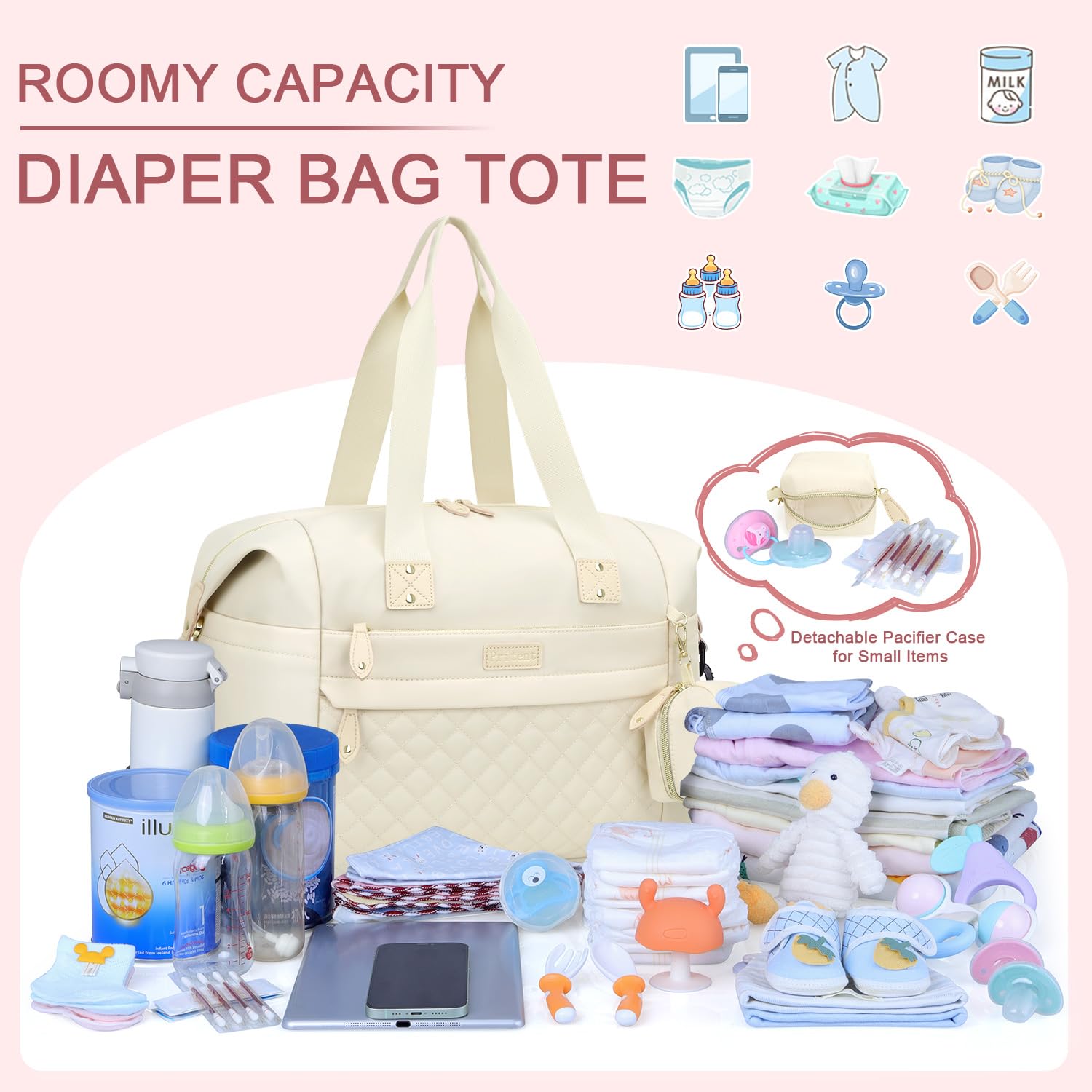 Diaper Tote - Diaper Bag with Pacifier Case, Shoulder Straps, Stroller Clips, Waterproof Mommy Bag for Mom and Dad, White