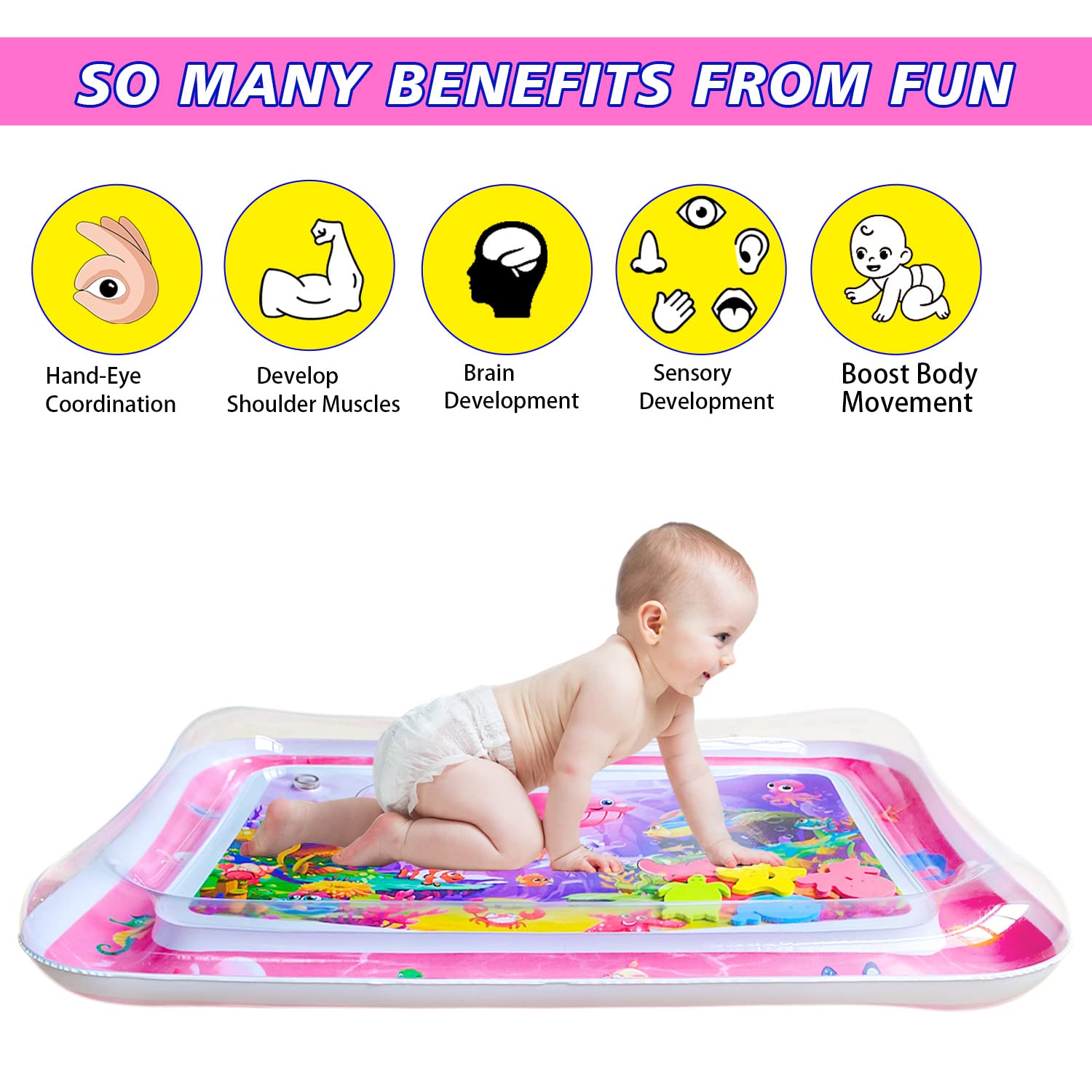 - 【Baby Water Mat and Safe】: The baby water play mat is made of BPA-free PVC materials that has been thoroughly tested, proved tummy water mat is comfortable soft, inflatable, leakproof .