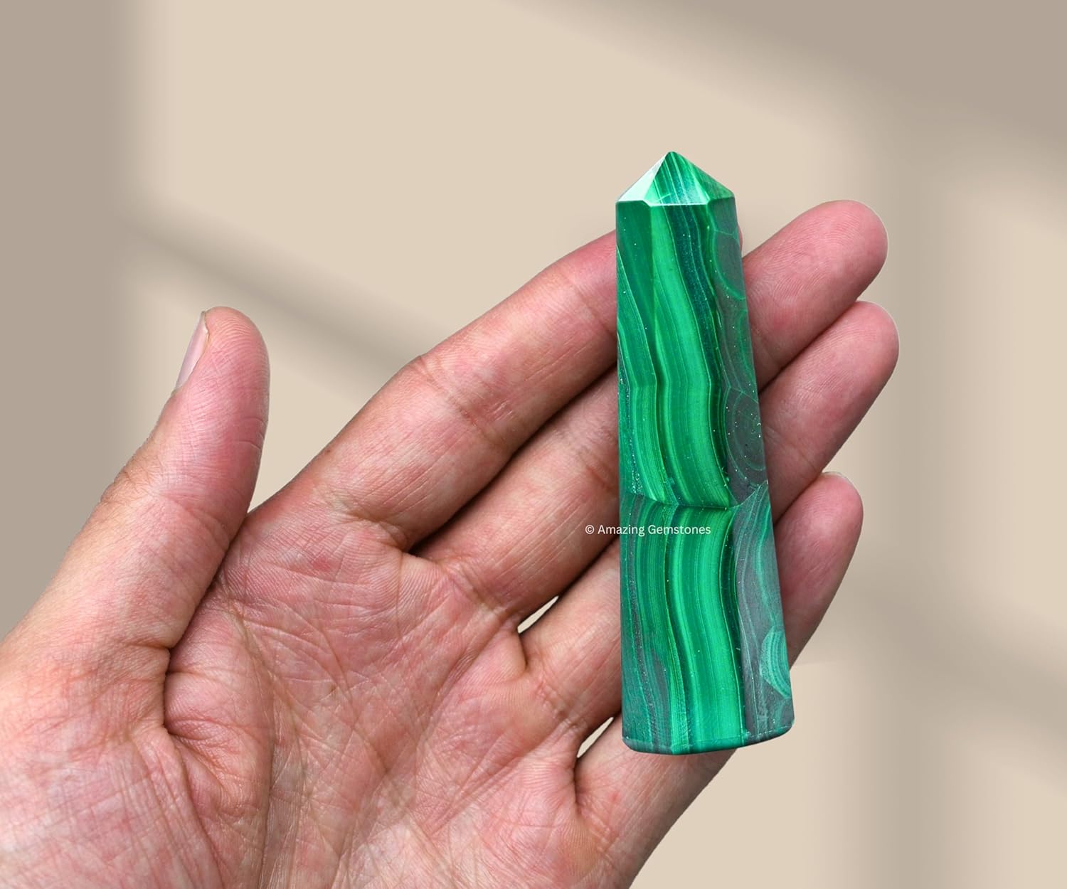- Malachite Crystal Tower will uplift and purify the energy (if its point is not damaged), so you can place it in any area that needs to be re-energized with strong energy. Length of this tower / wand / obelisk / point is 2" inch to 3" inch (5cm to 7.5cm) & width is 0.75 inch (2 cm).