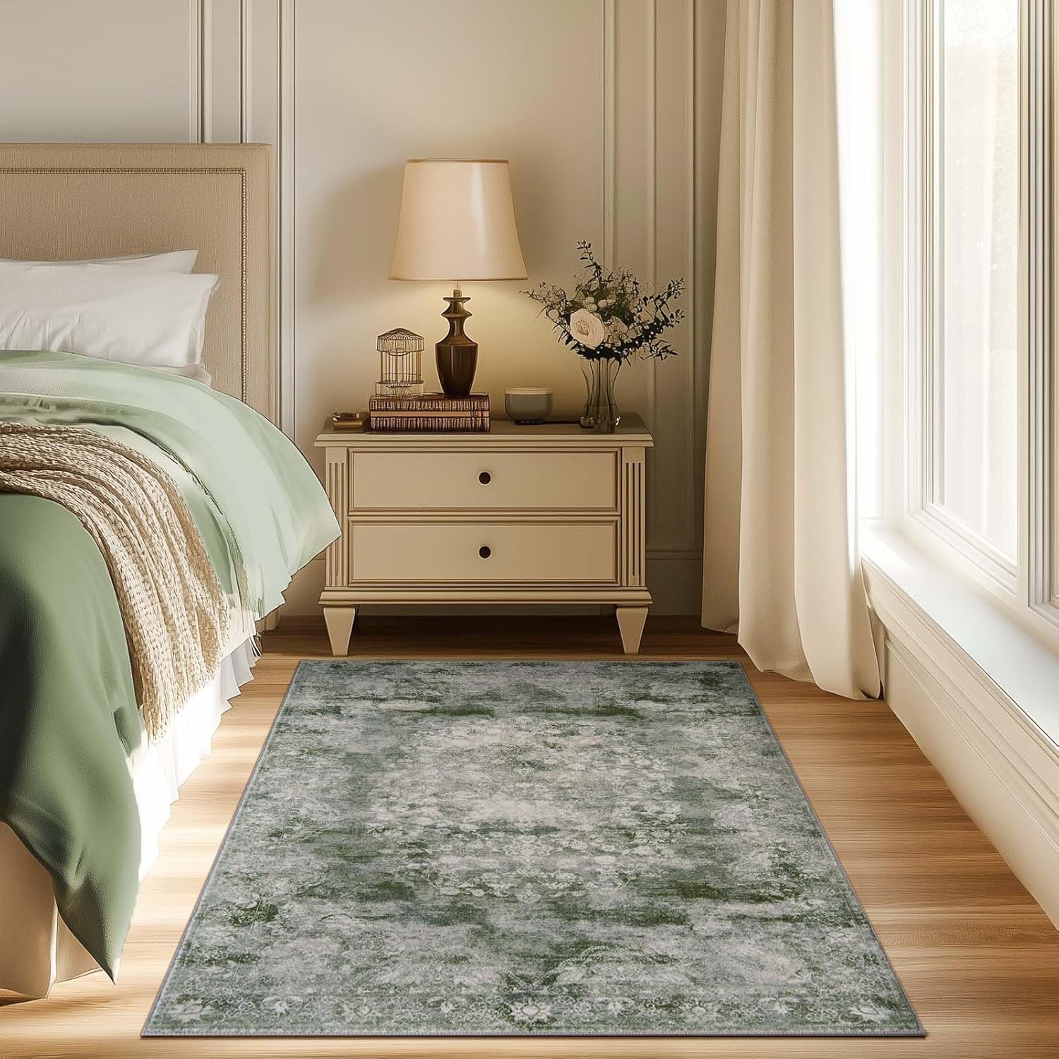 jinchan Green Floral 3x5 Area Rugs for Entryway - Machine Washable Vintage Distressed Design Low-Pile Soft Non-Shedding Carpet for Kitchen Bedside Laundry Living Room (3x5ft, Forest Green)