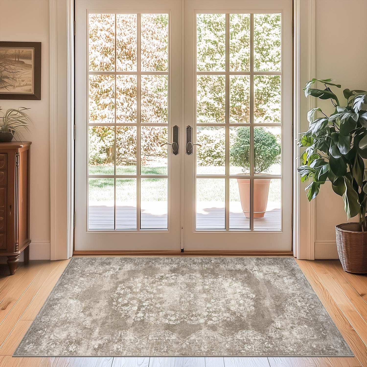 jinchan Washable Area Rug 3x5 Entryway - Soft Distressed Vintage Floral Indoor Bedroom Rug Faux Wool Low Pile Small Oriental Accent Carpet for Kitchen,Entrance,Bedside,Dining Room(Brown,3'x5')