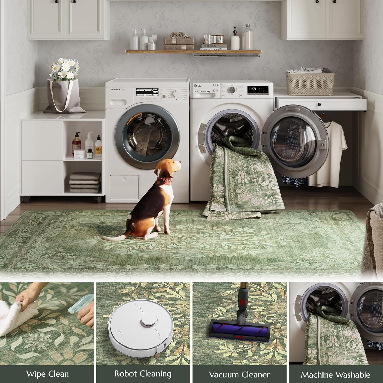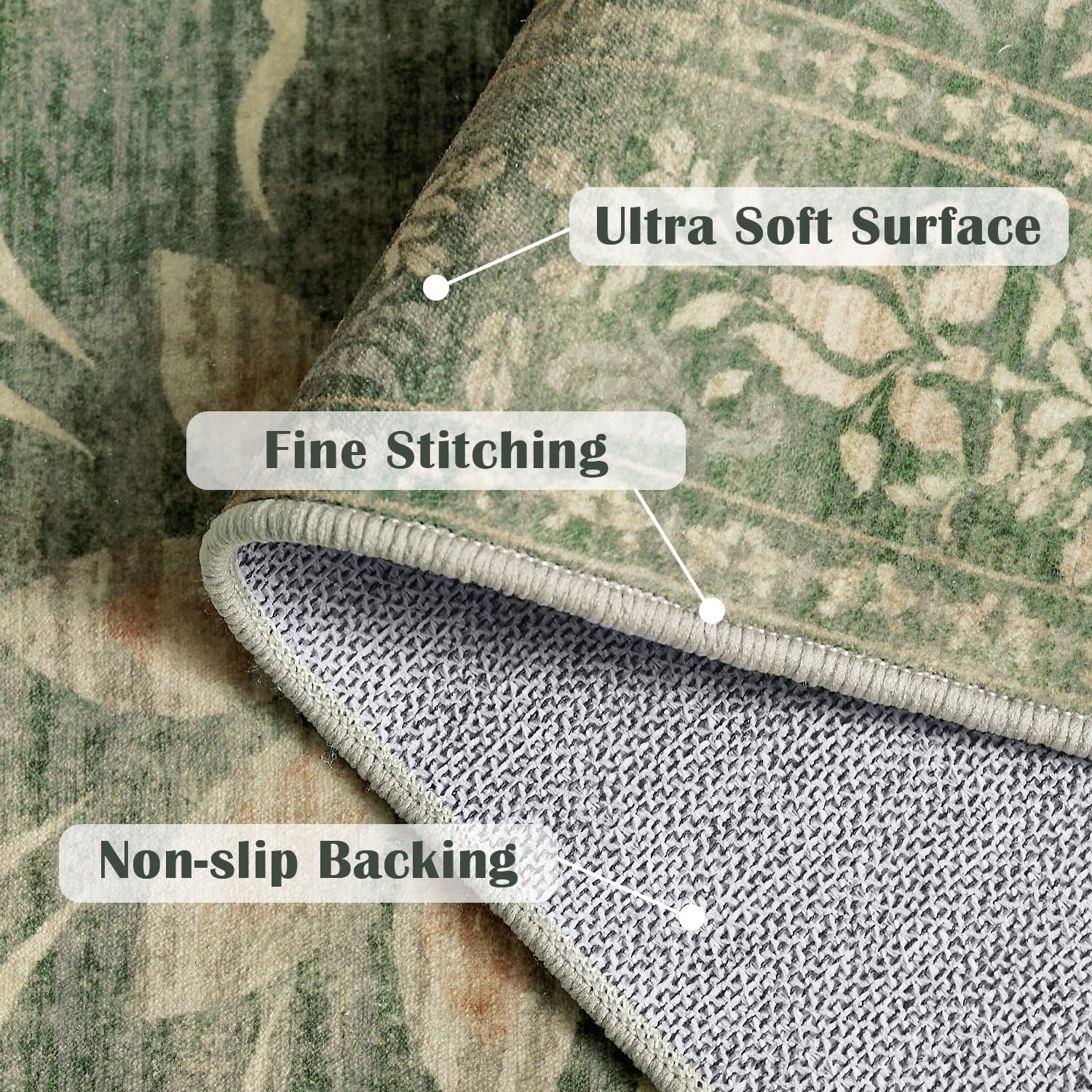 jinchan Vintage Floral Runner Rug 2x6 - Machine Washable Distressed Design Non-Slip Low-Pile Soft Thin Carpet for Hallway Kitchen Farmhouse Bedroom Entryway Laundry Room (2x6ft,Dark Green)