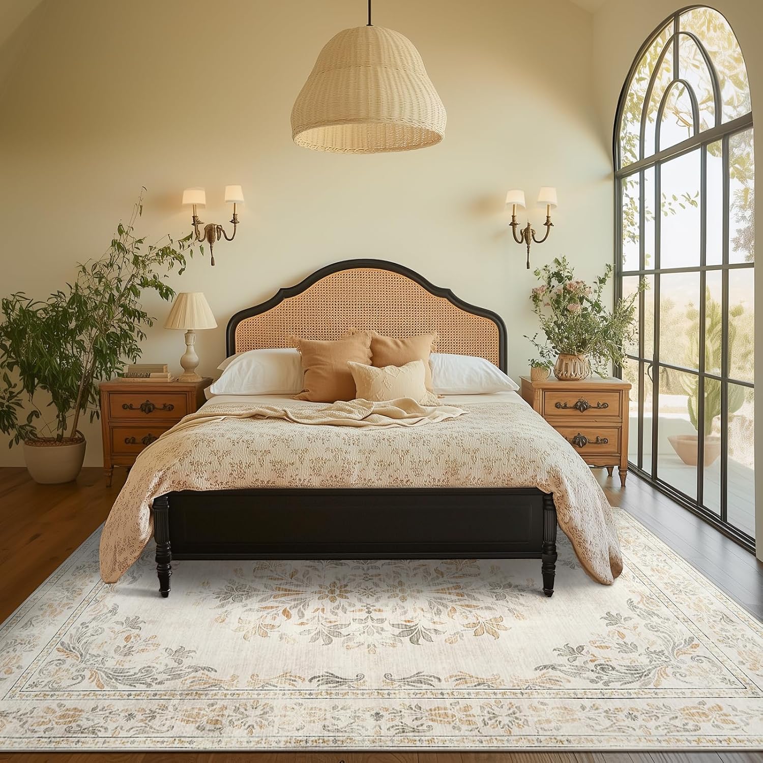 jinchan Vintage Floral 6x9 Area Rugs for Living Room - Machine Washable Distressed Design Soft Throw Rug Ultra-Thin Non-Slip Large Carpet for Bedroom Nursery Dining Room Home Office (6x9ft,Light Grey)