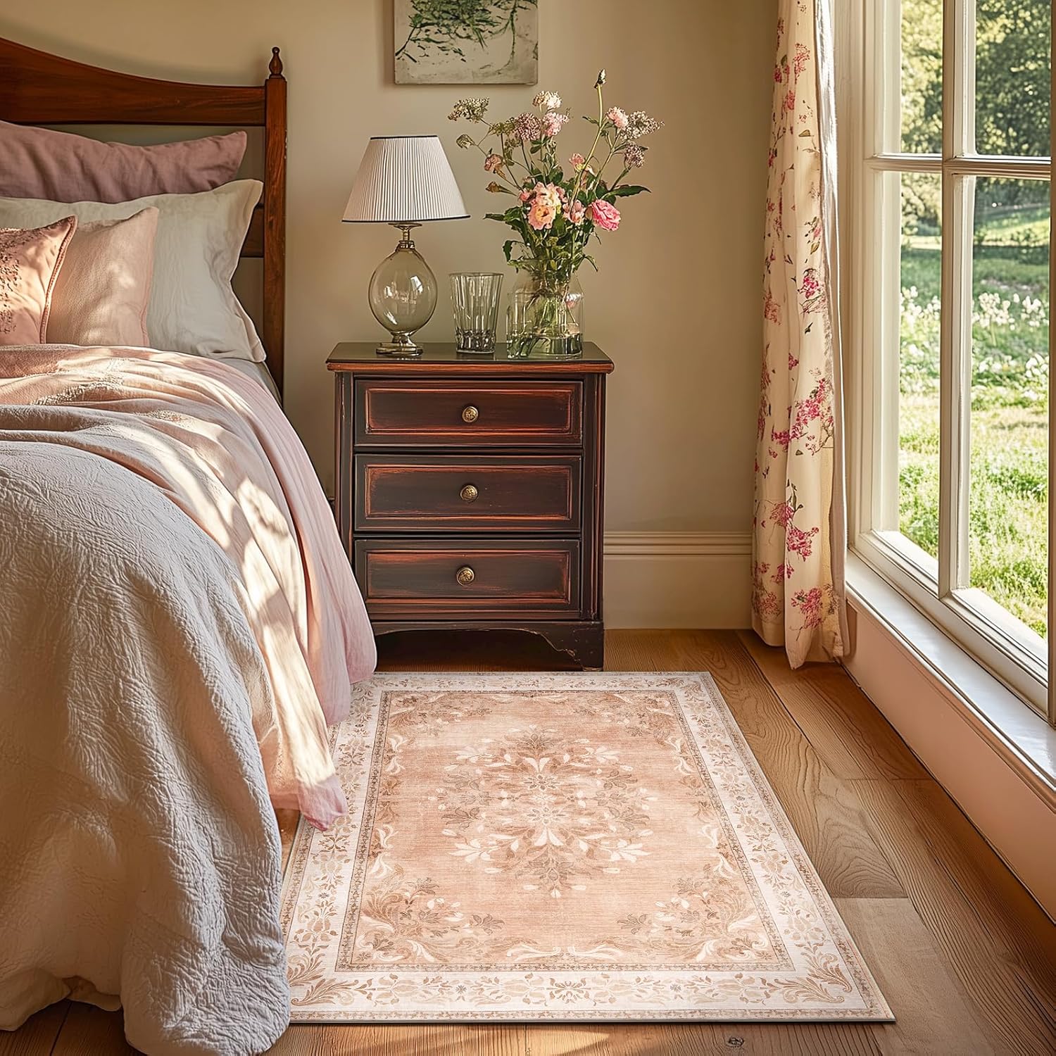 jinchan Vintage Floral 3x5 Area Rugs for Entryway - Machine Washable Distressed Design Ultra-Thin Low-Pile Soft Non-Shedding Carpet for Kitchen Bedroom Entrance Laundry Living Room (3x5ft,Coral Pink)