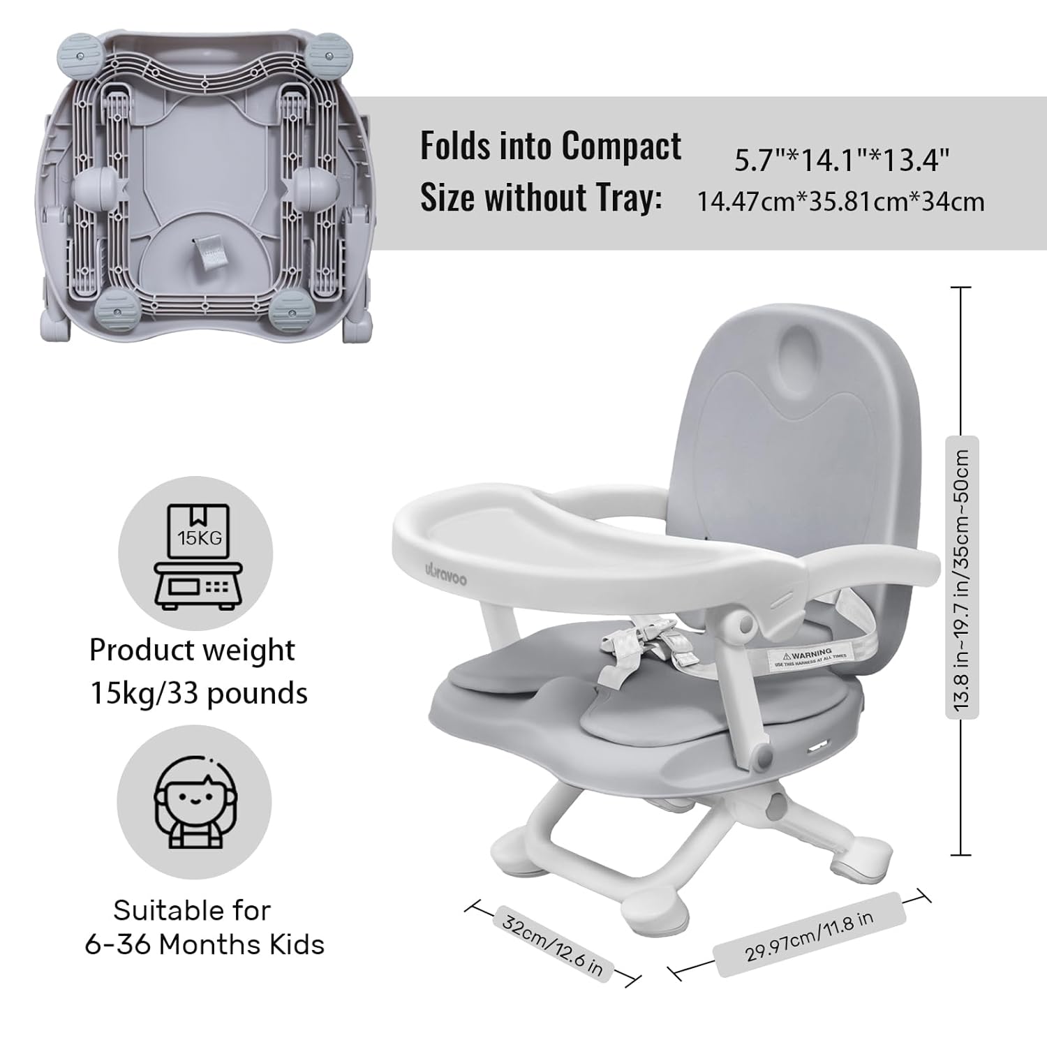 - Grow with Baby: This toddler booster chair fits babies and toddlers from 6 months to 3 years, which has 4 adjustable heights, just push inward the buttons at the centre of "X" supporting legs and then lift up or lower it.
