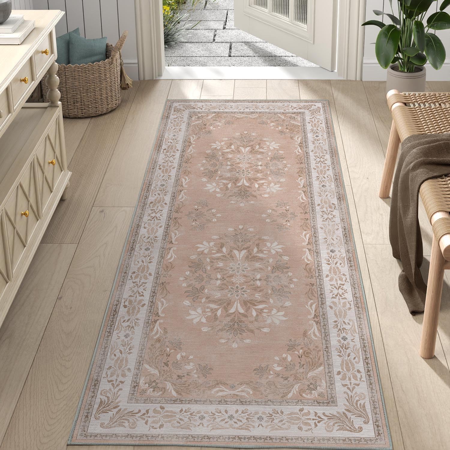 jinchan Vintage Floral Runner Rug 2x5 - Machine Washable Distressed Design Non-Slip Low-Pile Soft Thin Carpet for Hallway Kitchen Farmhouse Bedroom Entryway Laundry Room (2x5ft,Coral Pink)