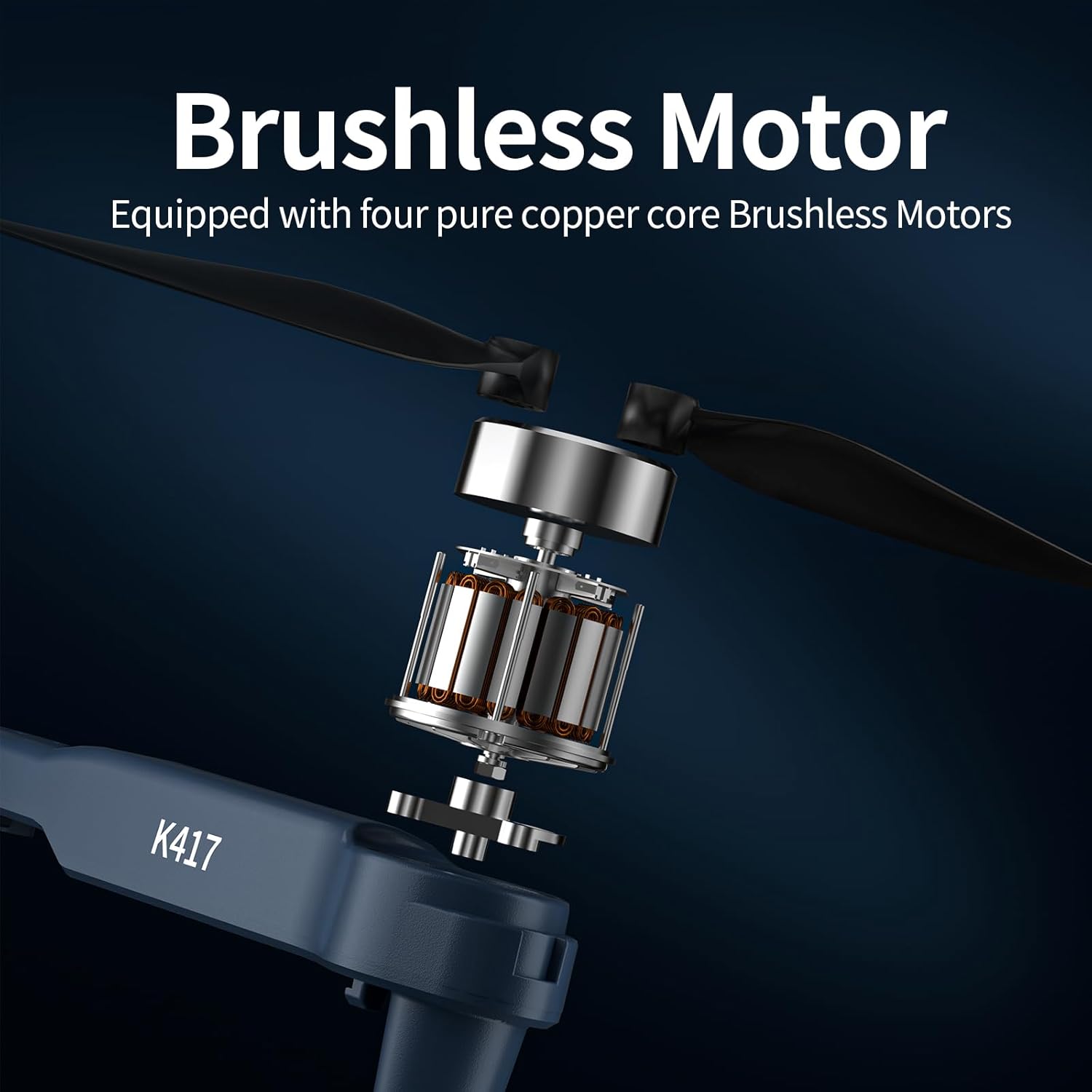 - K417 brushless motor Drone capable of reaching a max speed of 6000rpm. Brushless motors have no brushes, which leads to reduced friction and energy loss. They can respond to changes in torque more quickly, making them more efficient, easier to control, and have a longer lifespan. Brushless motors camera drone utilize high-quality magnets, coils and bearings, enabling it to maintain stable performance at high speeds and high loads, providing powerful thrust output and improved wind resistance.