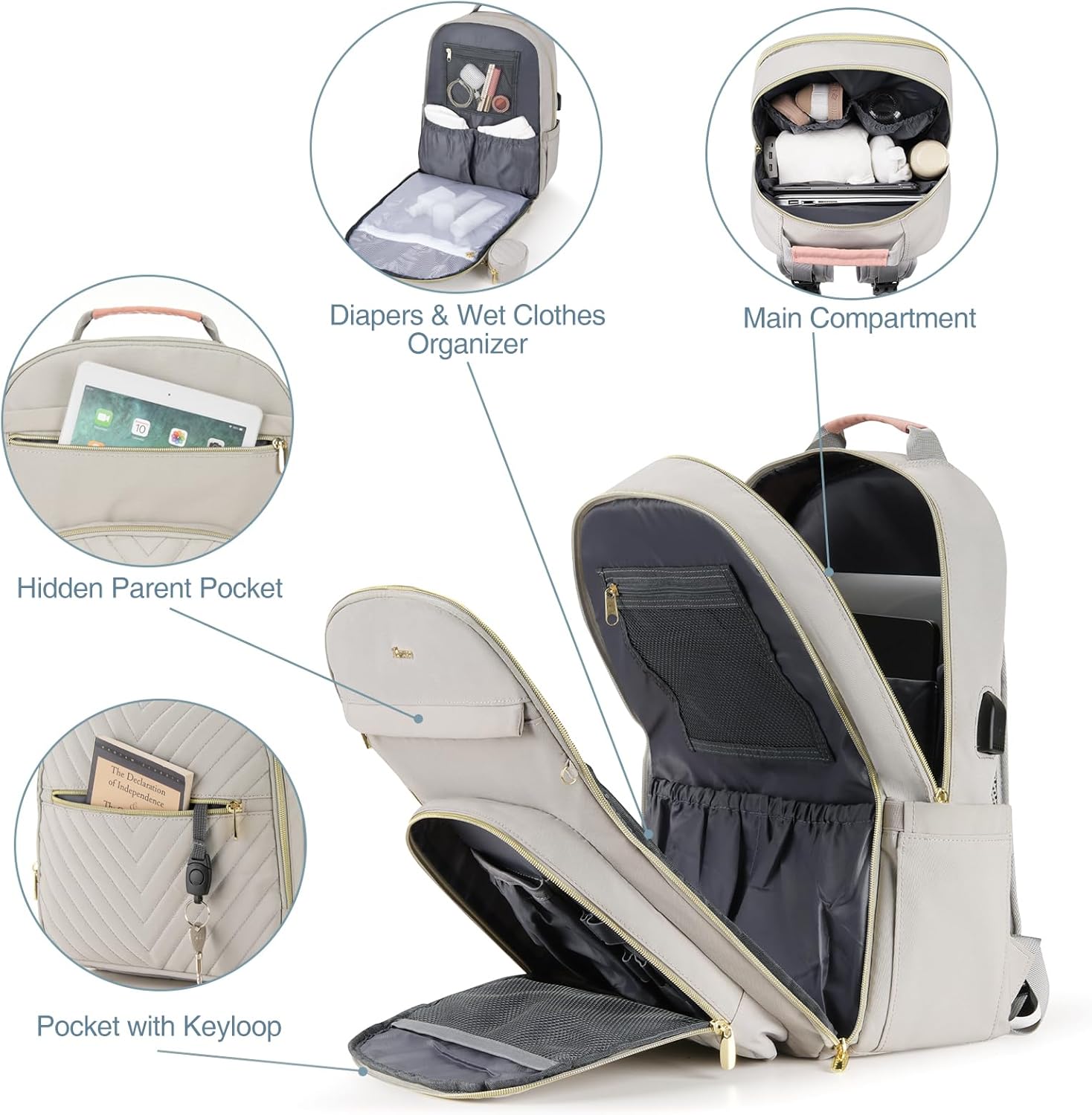 - Convenient and Thoughtful: Baby diaper bag features 15.6’’ padded laptop pocket and 12.9’’ iPad pocket in the main compartment, USB charging port, 2 built-in stroller straps, waterproof pocket, back anti theft pocket, dual zippers for easy access and closure even with one hand! Also we have added a luggage sleeve on the back so it can easily slide over a carryon luggage while on the go.