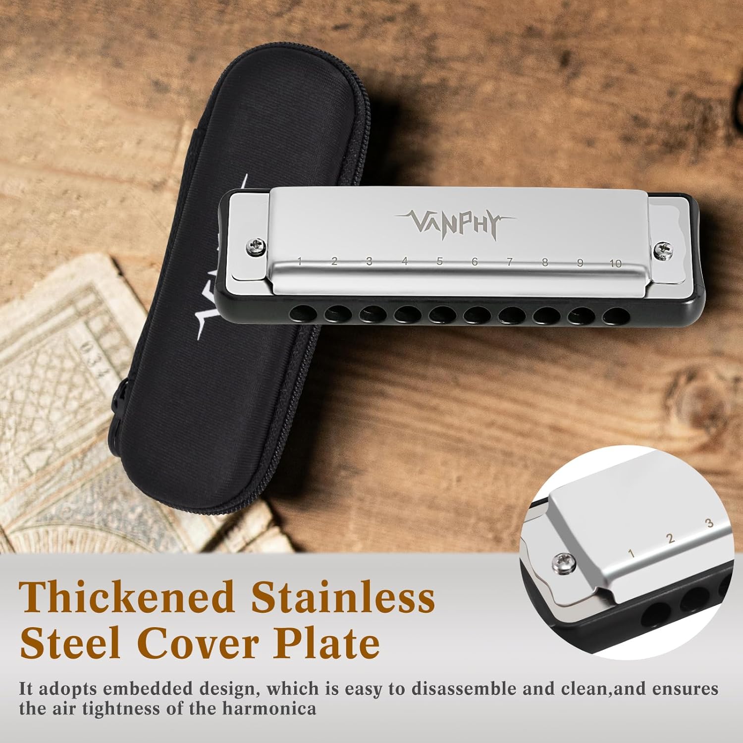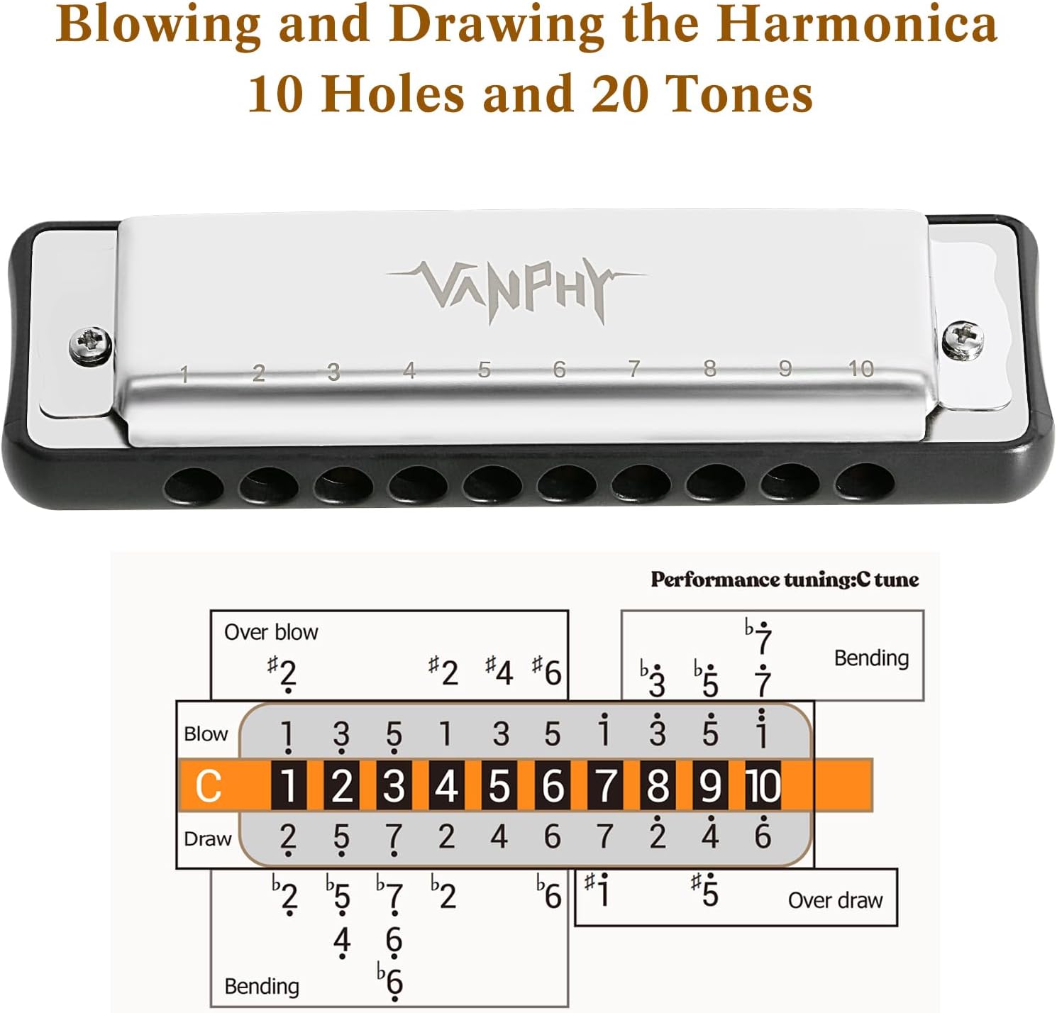 - High Fashion Appearance: VANPHY 10-hole harmonica has a unique design on the appearance. The smooth material makes the product itself more advanced.The concave arc design makes the product look more fashionable and distinctive, and also enhances the comfort of the hand to a certain extent
