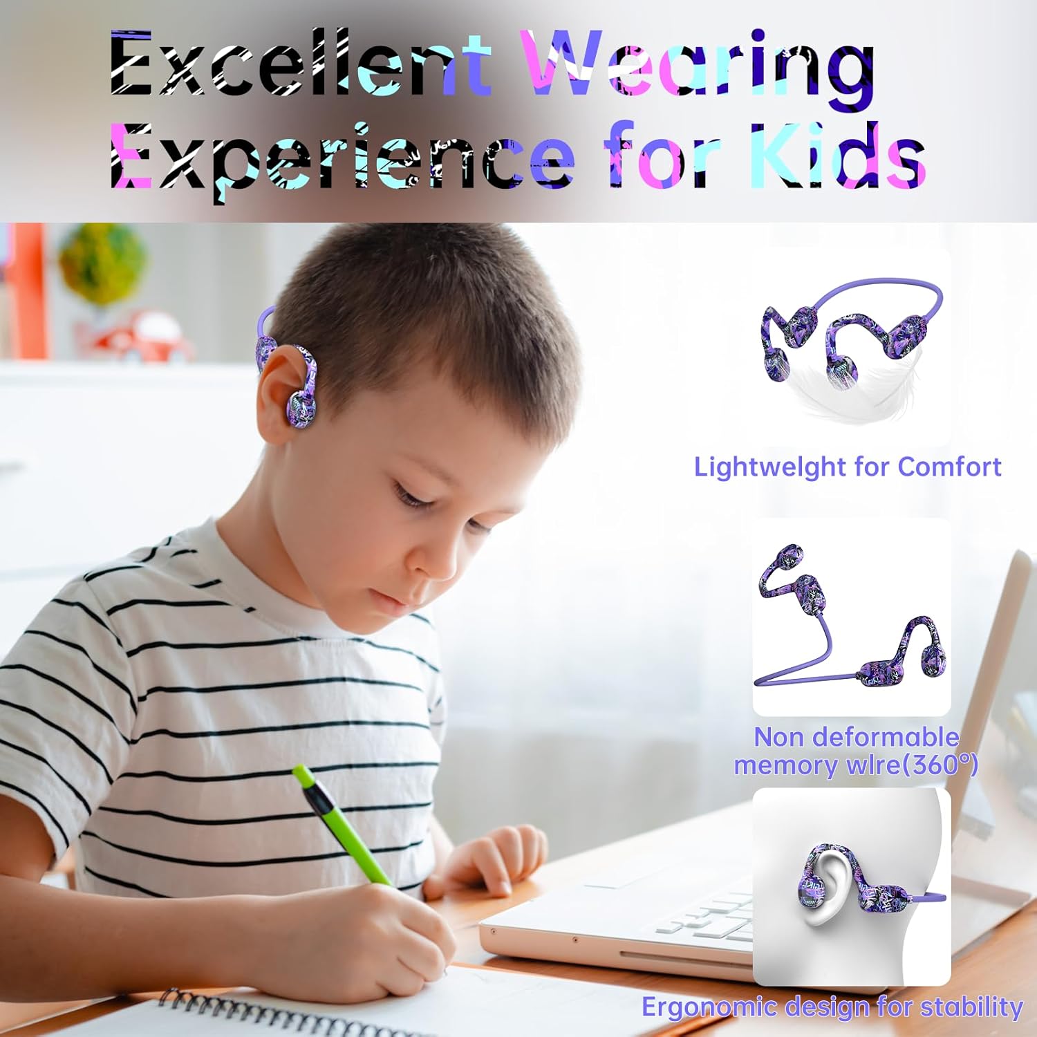 - [Ultra-Safe Design]: Our headphones for kids feature a new generation open-ear design - Air Conduction Technology. They can directional deliver premium audio without muffling kids' ears which can ensure your kids can hear surrounding noise. This special design ensure your kids enjoy unique listening experience while studying at home, school, train, all while avoid some dangerous situations from happening. 85dB volume limitation design fully meets the recommended level to prevent hearing damage.