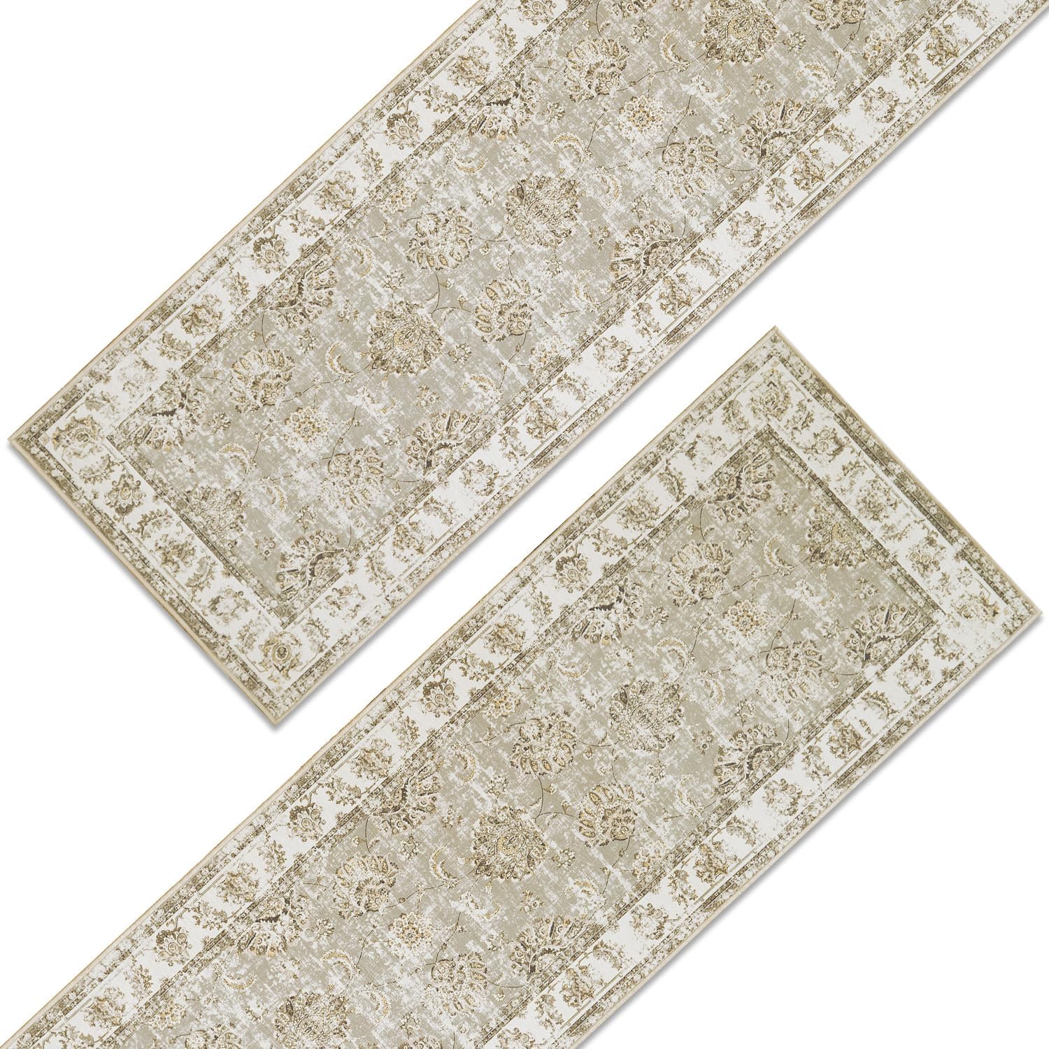 jinchan Runner Rug 3x10-2pcs Kitchen Washable Vintage Hallway Rug Floral Print Floor Cover Indoor Thin Retro Mat Accent for Bathroom Laundry Room Bedroom Office Farmhouse (Double,Taupe)