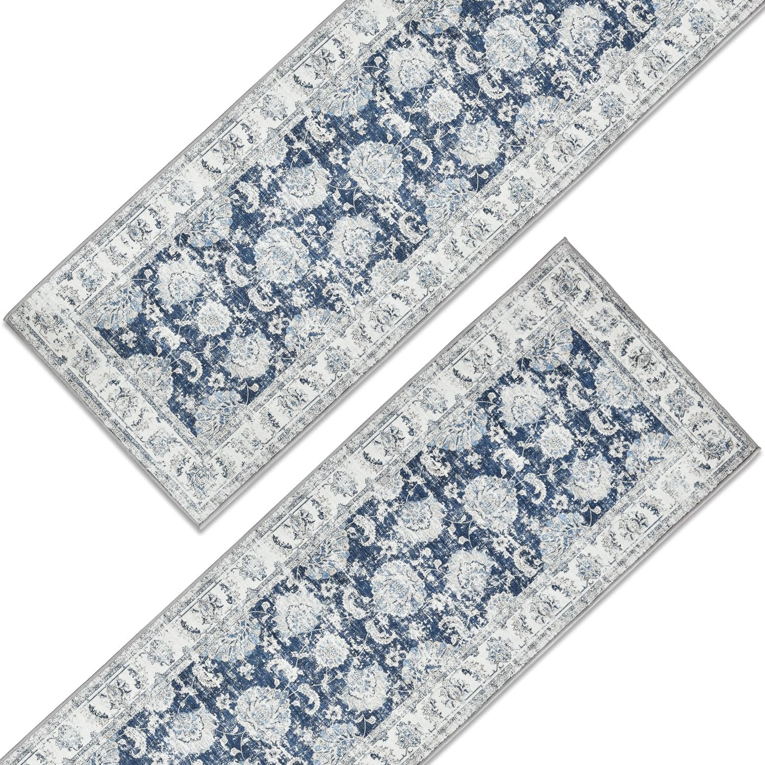 jinchan Runner Rug 3x8-2pcs Kitchen Washable Vintage Hallway Rug Floral Print Floor Cover Indoor Thin Retro Mat Accent for Bathroom Laundry Room Bedroom Office Farmhouse (Double,Dark Blue)