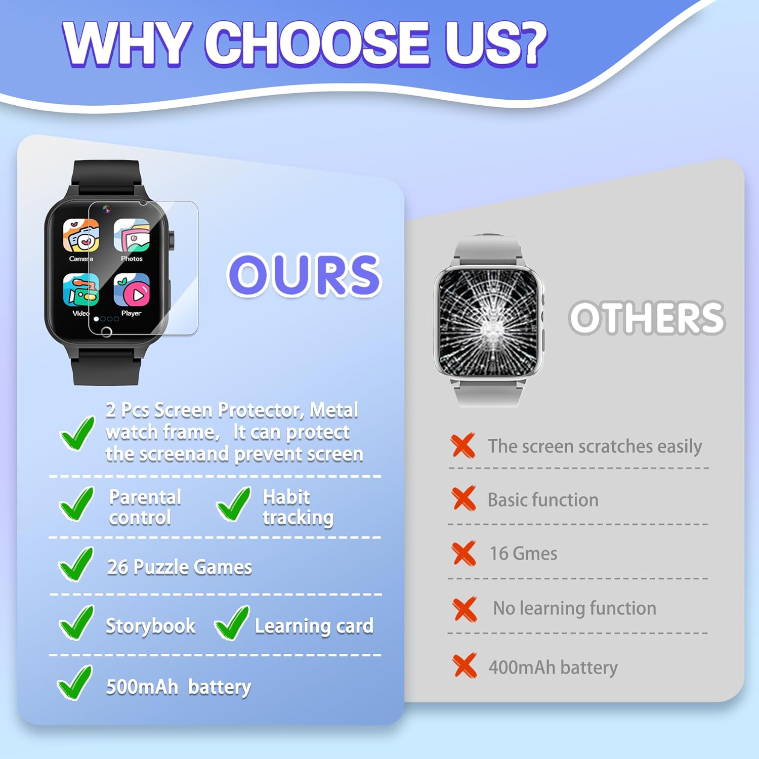 - 【Upgrade Kids Watch】As the upgrade kids smart watch with 2*screen protector, introduces the habit tracking function, stories, and learn card that traditional watches don't have, cultivating children's good habits and imagination. And with playable 26 games to choose from kids. These are suitable for children of multiple ages. That can effectively exercise kids brain and logical thinking ability. It is a perfect gift for 4-12 year old boys and girls.