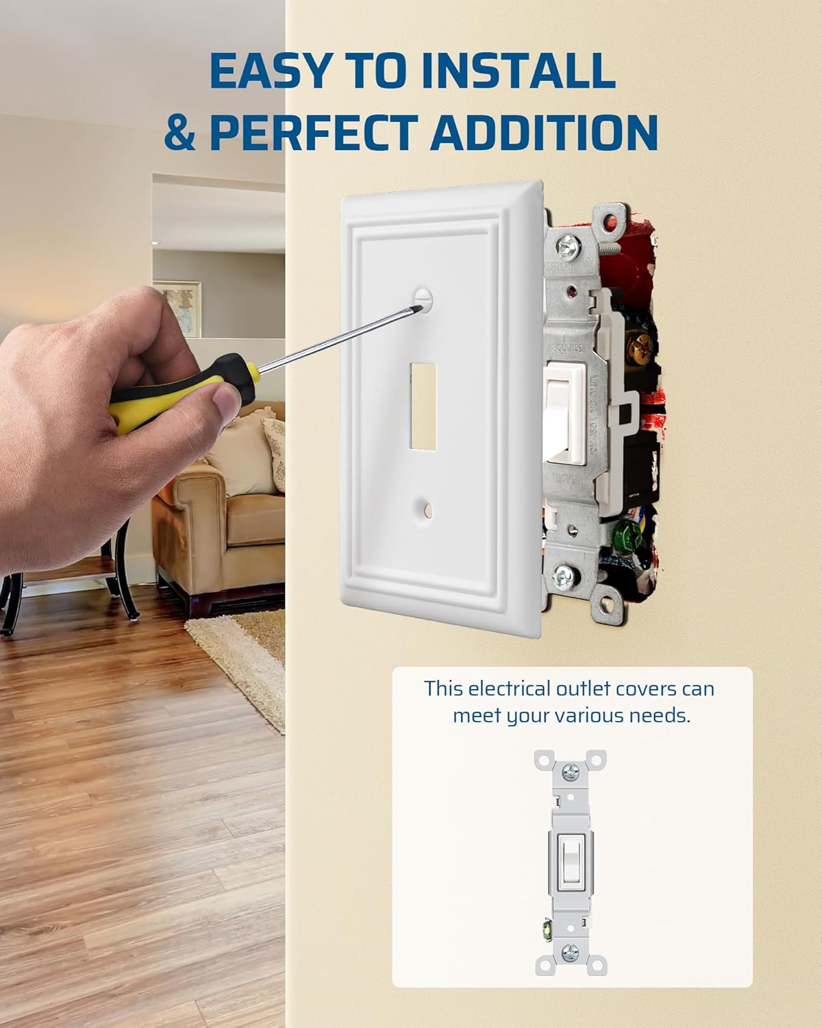 - [Classic White Finish] White finish seamlessly blends into any decor style, great for living rooms, bedrooms, bathrooms, and kitchens; our light switch covers enhance your home's look and add a modern, upscale vibe
