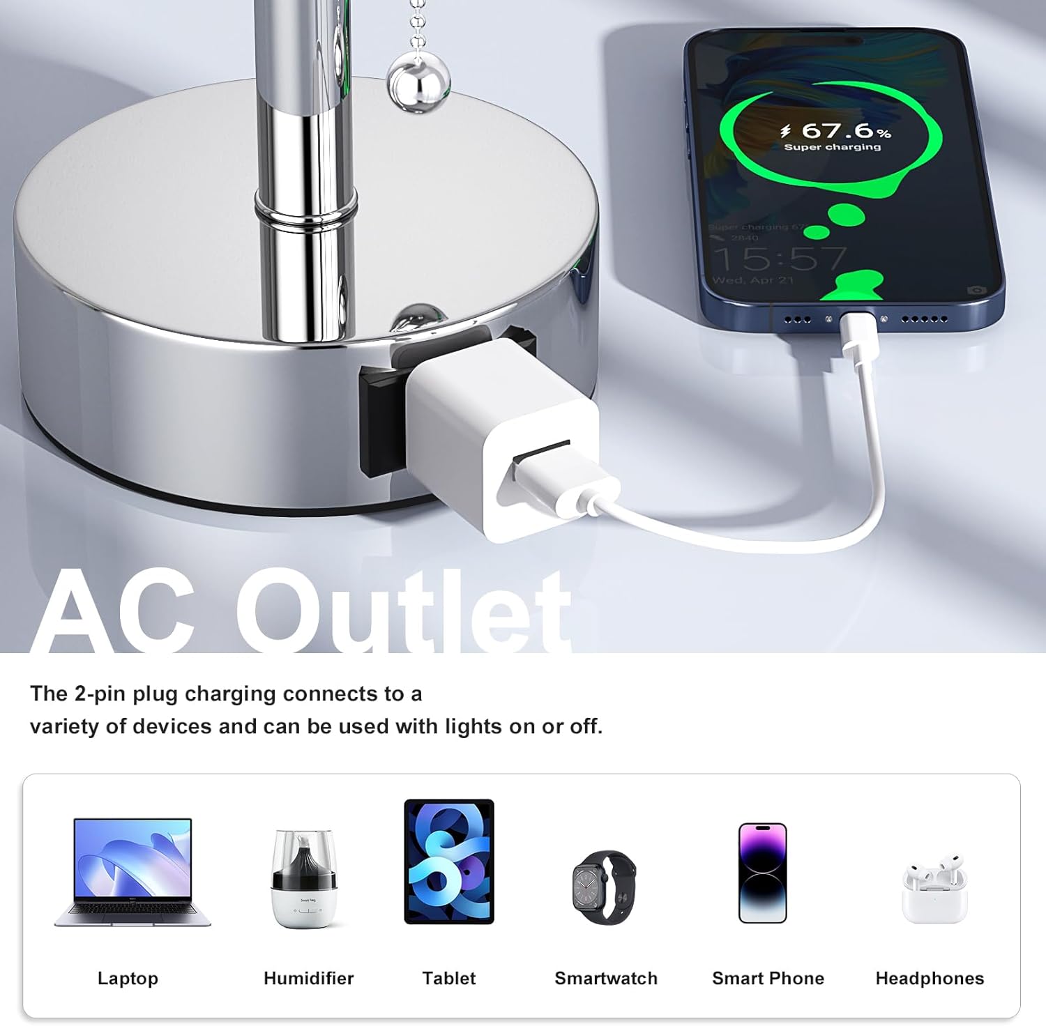- Bedside Lamps Set with Practical AC Outlet - This modern bedroom lamps kit provides a convenient AC outlet that eliminates the need for additional power outlets, simplifies desktop wiring, and keeps your desk tidy. The two-pin plug is always available for connection to other devices, such as your cell phones, tablets, laptops, humidifiers, smart watch and more, regardless of whether the matching bed lamp is on or off. This compact night lamp is ideal for small office or study environments