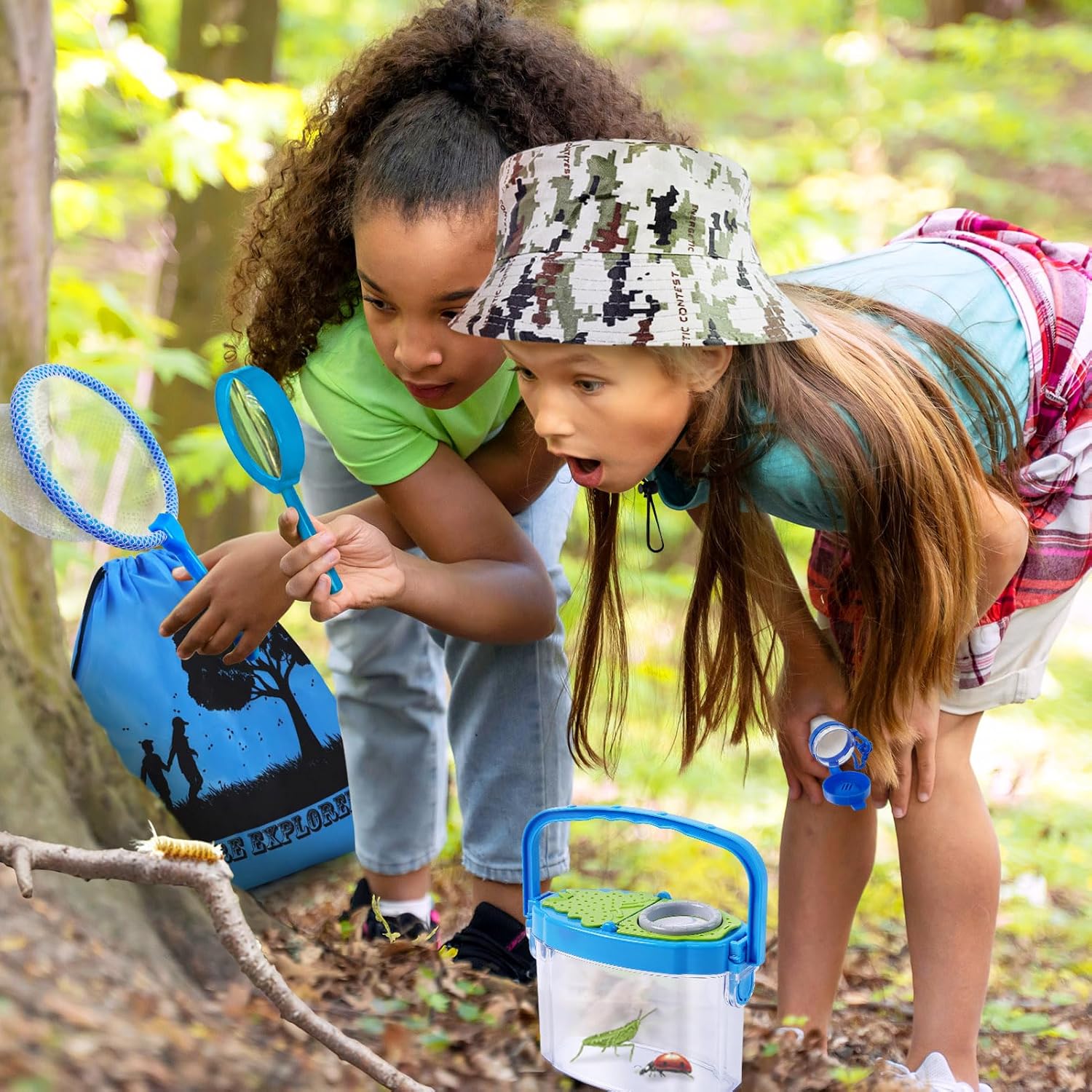 - ALL-IN-ONE EXPLORATION AND BUG CATCHING KIT: This 12-piece set includes a backpack, hat, magnifying glass, binoculars, compass watch, flashlight, whistle, clip, butterfly net, tweezers, bug cage, bug jar, offering everything your child needs for outdoor adventures.
